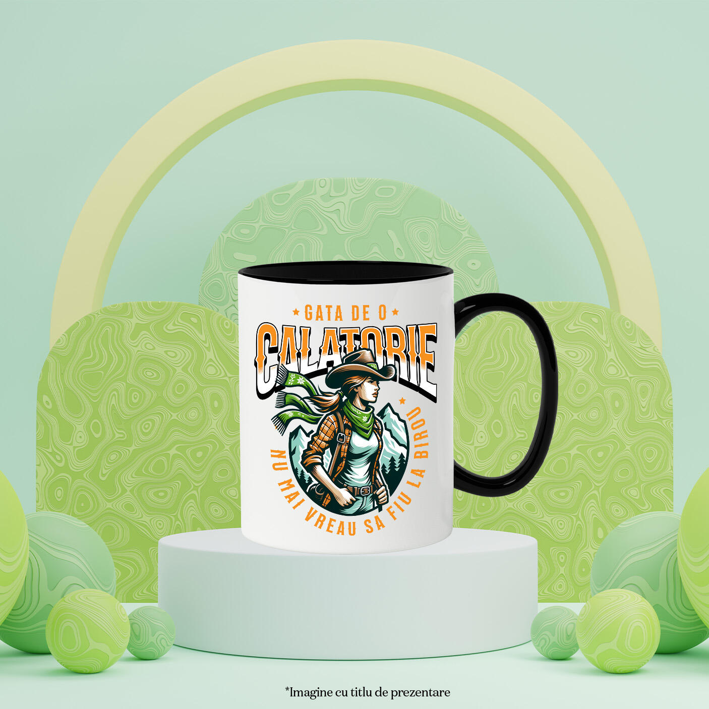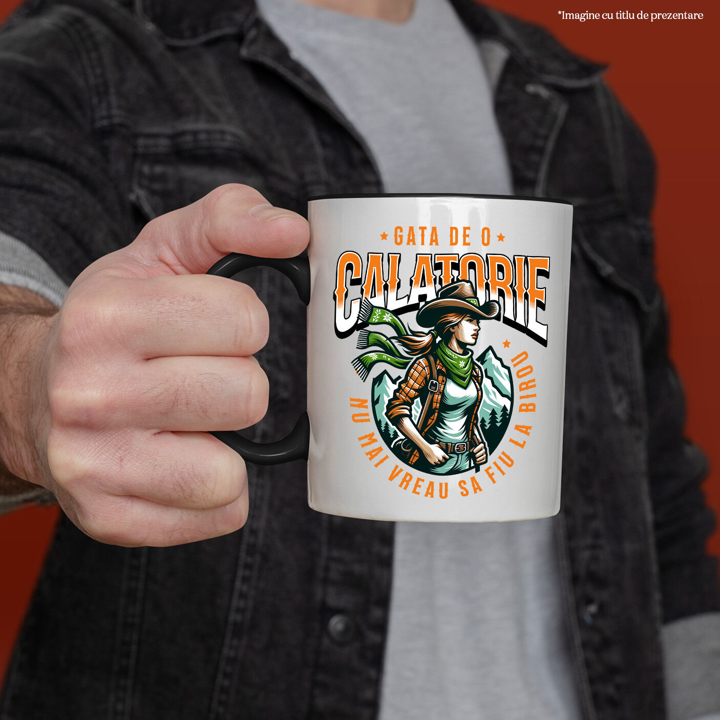 Cana Personalizata cu Fata Cu palarie Si Rucsac Aventura Intre munti Natura, Calatorii, Amintiri, Ceramica, 330ML, cu Maner Negru