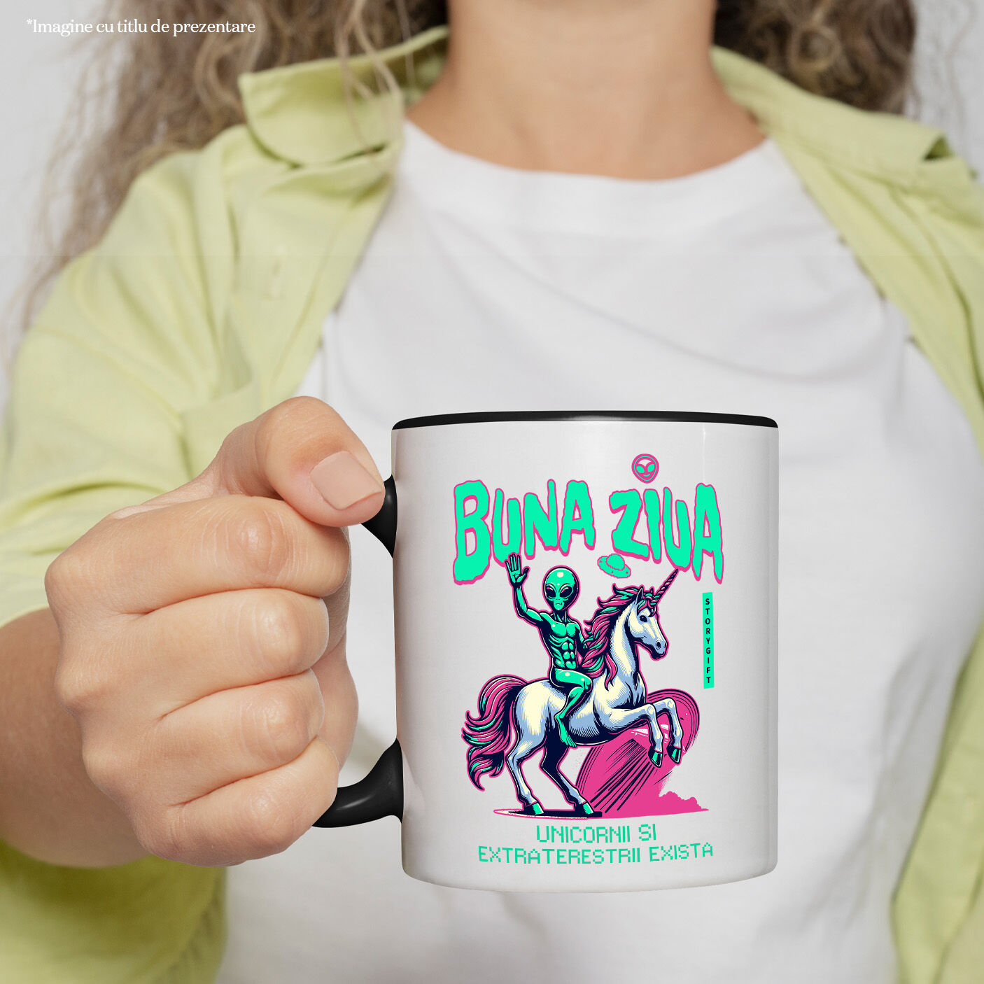 Cana Personalizata cu Extraterestru Verde Corp Uman Calarind un Unicorn Roz Desene Animate Copii, Lume Digitala, Ceramica, 330ML, cu Maner Negru