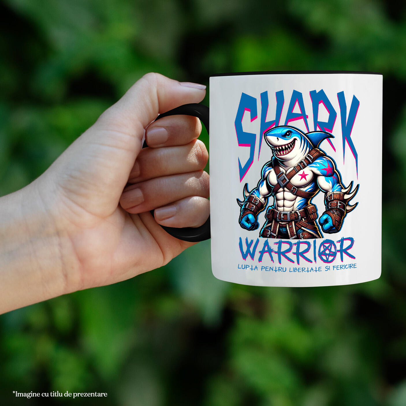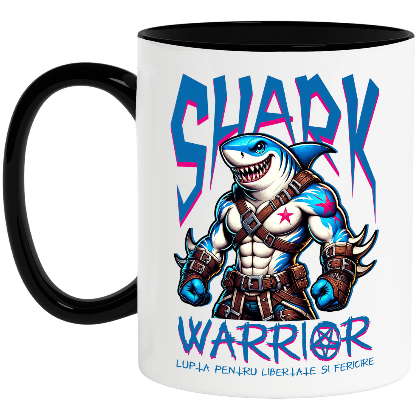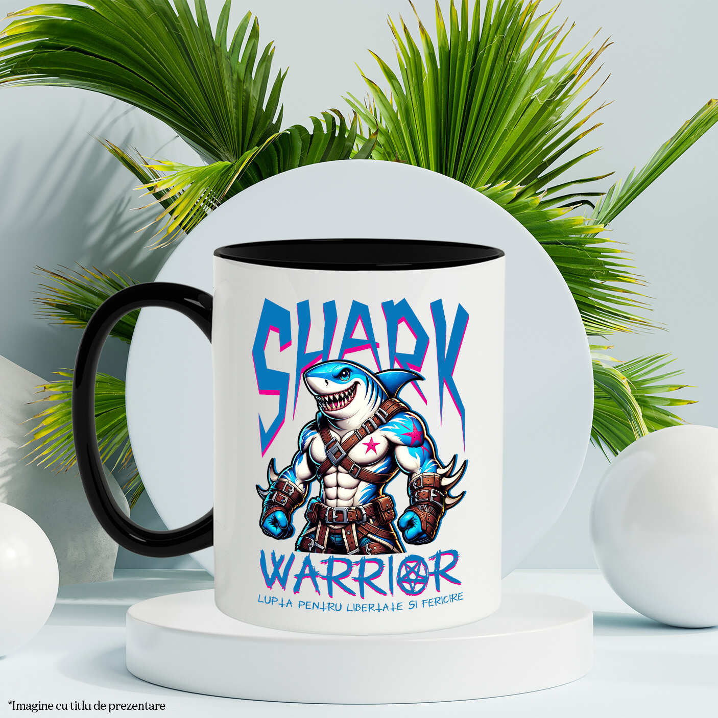 Cana Personalizata cu Rechin Puternic Si Furios Cu arme Si Colt Lupta libertate Si Fericire, Ceramica, 330ML, cu Maner Negru