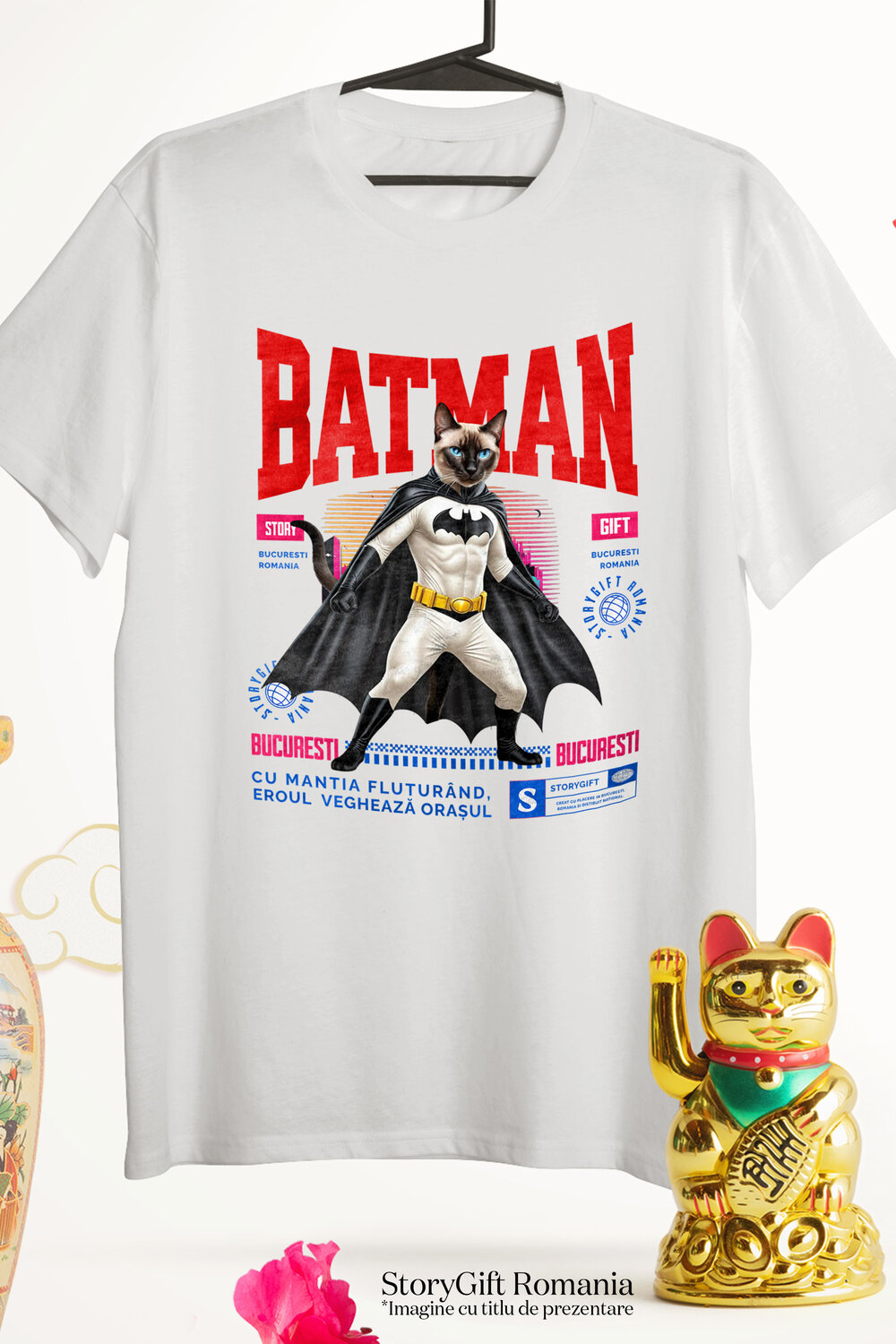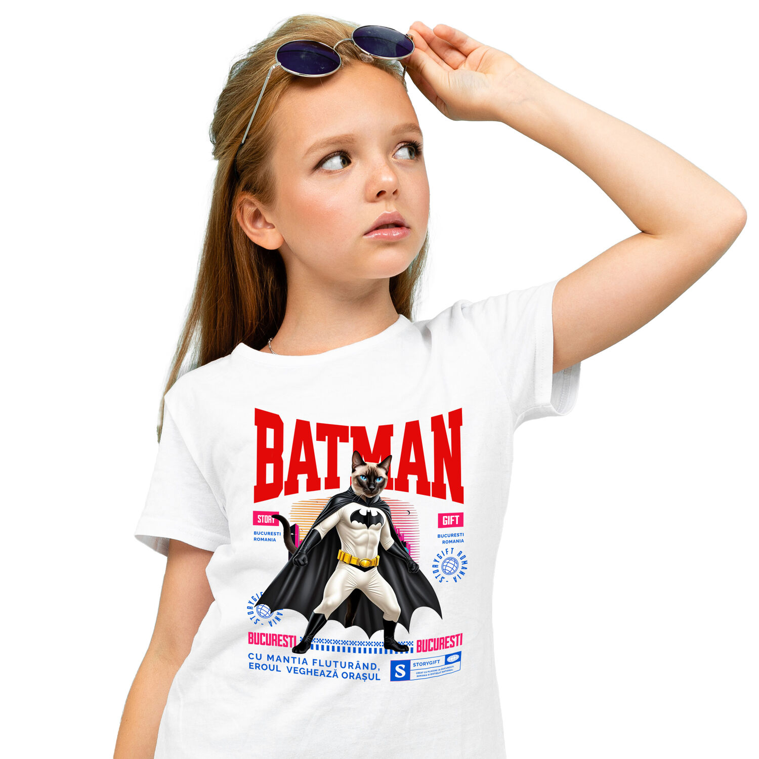 Tricou Copii cu Siamez / Siamese Pisica In Costum de BatMan cu Pelerina, Erou Nocturn, Desene animate, Copii, Iubitorii de Animale cu imprimeu pe Fata, 100% Bumbac, Alb, 6 Ani