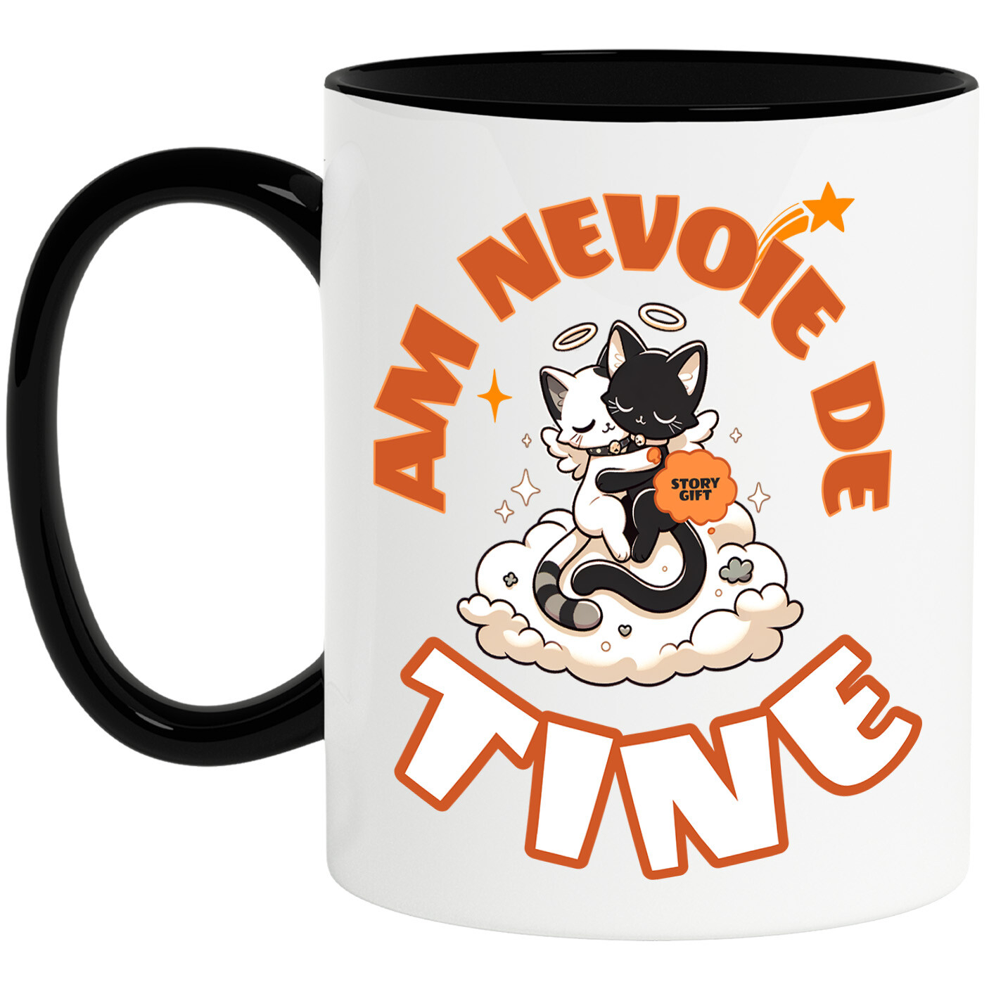 Cana Personalizata cu Cuplu Pisici Ingeri Alb Si Negru Pe Nor Pufos Valentine's Day, Ceramica, 330ML, cu Maner Negru