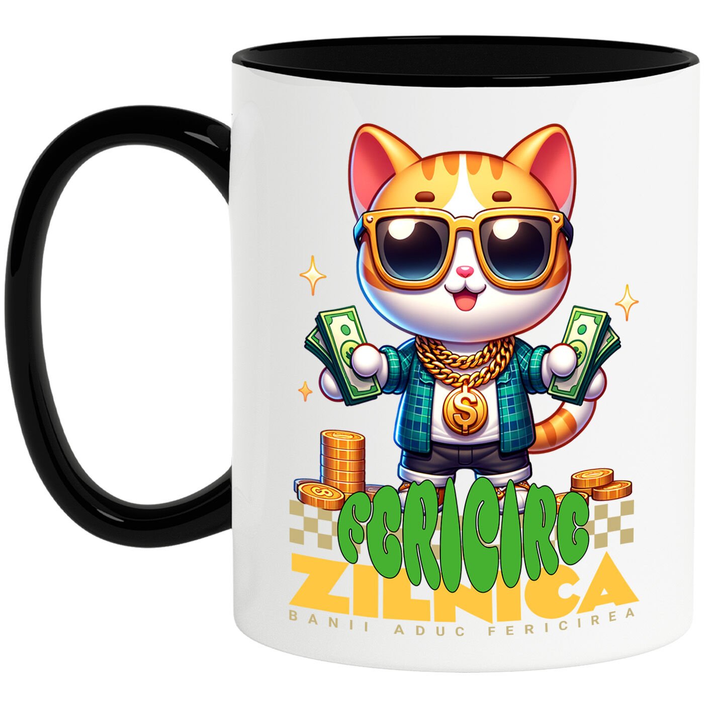 Cana Personalizata cu Pisica Stil Gangster Cu Bancnote Bani si Bijuteri de Aur, Monede, Avere, Milionar., Ceramica, 330ML, cu Maner Negru