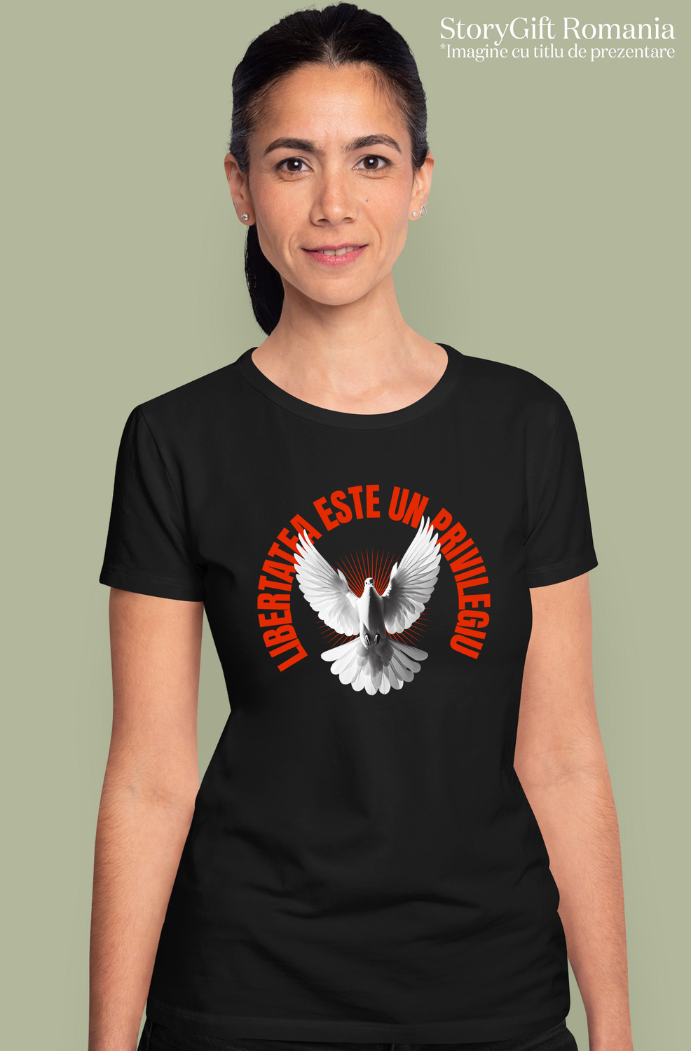 Tricou Femei cu Porumbel Alb Aripi Imense Simbol Puritate Libertatea cu imprimeu pe Fata, 100% Bumbac, Negru, L