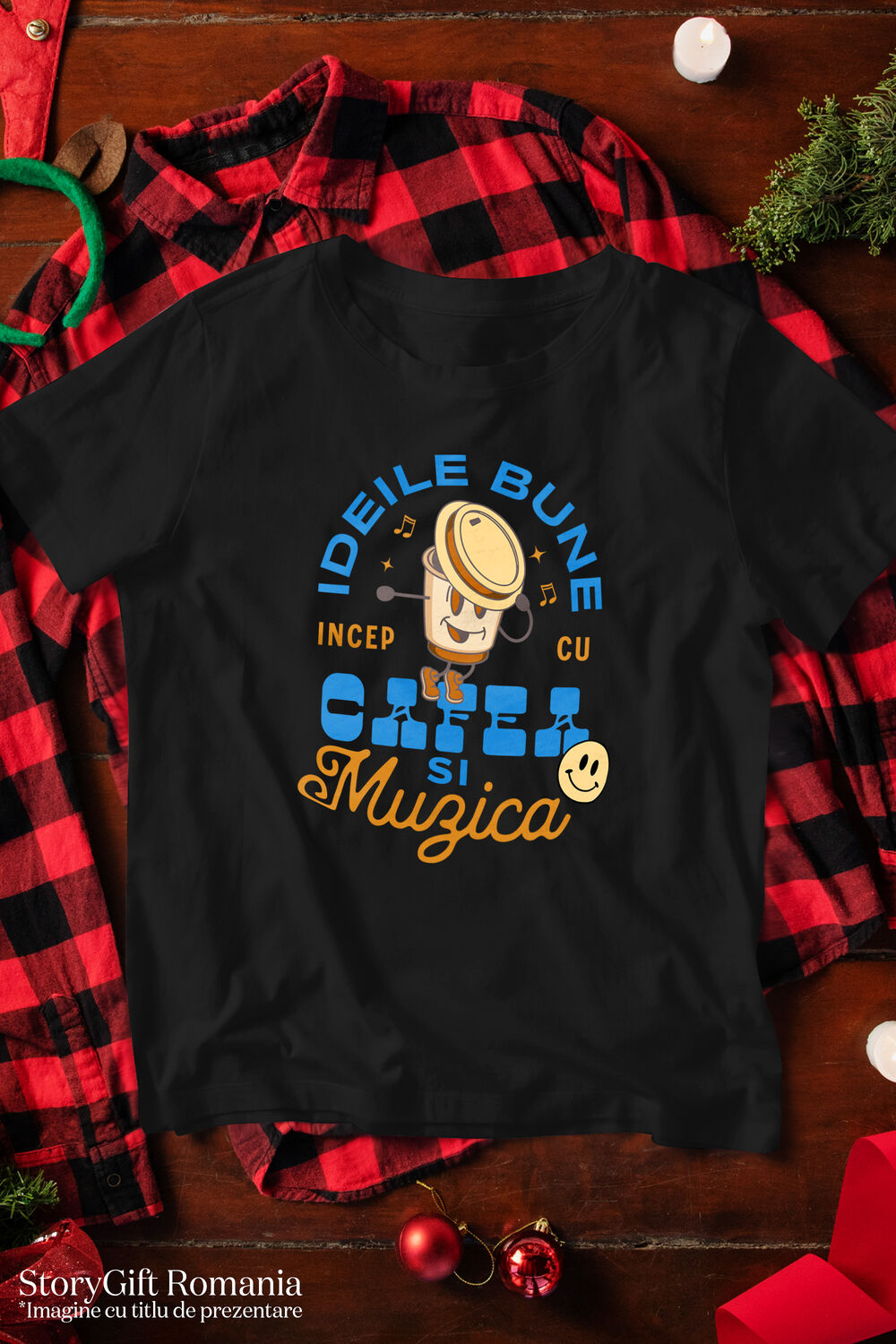 Tricou Barbati cu Pozitie de dans Pahar De cafea Vesel, Smiley Face, Energie Dimineata grea, Zi Perfecta cu imprimeu pe Fata, 100% Bumbac, Negru, L