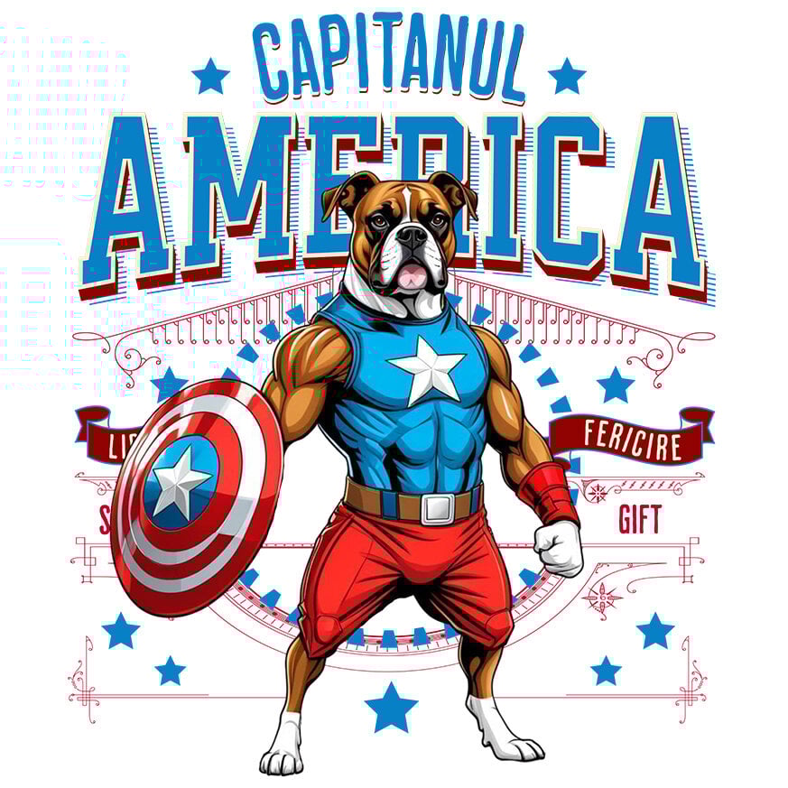 Sticker Personalizat cu Boxer Caine In Costum de Capitan America cu Pelerina, Erou Nocturn, Desene animate, Copii, Iubitorii de Animale cu Margini Albe, PVC Vinyl 10 cm