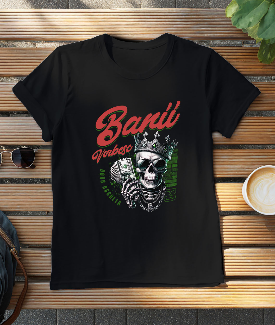 Tricou Barbati cu Craniu Cu Coroana De Rege Si Ochelari De Soare Bancnote Bani cu imprimeu pe Fata, 100% Bumbac, Negru, L
