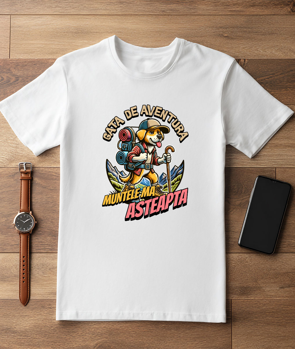 Tricou Barbati cu Caine Animal Blanos Aventura Pe Munte Cu Rucsac, Natura, Zona montana cu imprimeu pe Fata, 100% Bumbac, Alb, L