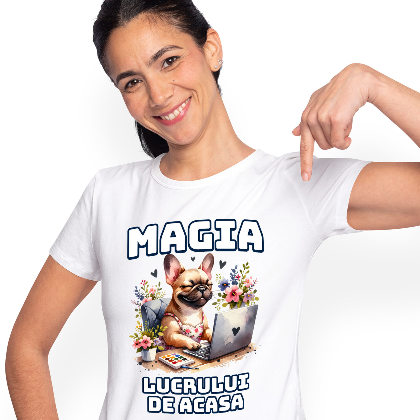 Tricou Femei cu Caine la Birou Lucrand De Pe Calculator, Buchet De Flori, Lucrat De Acasa cu imprimeu pe Fata, 100% Bumbac, Alb, S