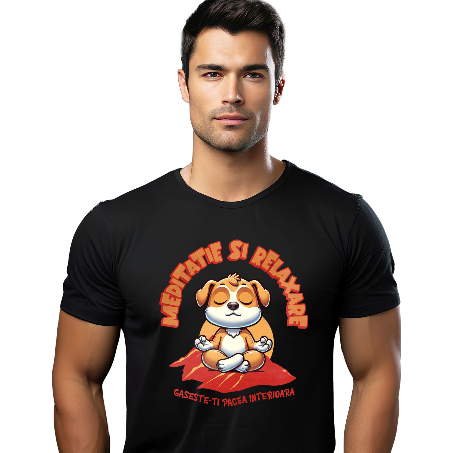 Tricou Barbati cu Caine Relaxat Pozitie Yoga, Echilibru Spiritualitate, Munte, Natura cu imprimeu pe Fata, 100% Bumbac, Negru, L