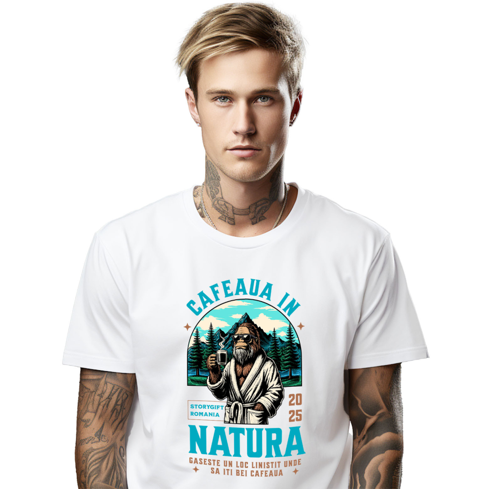Tricou Barbati cu Animal Gorila In Halat La Munte Cafea Fierbinte Aventura, Padure, Calatorii cu imprimeu pe Fata, 100% Bumbac, Alb, L