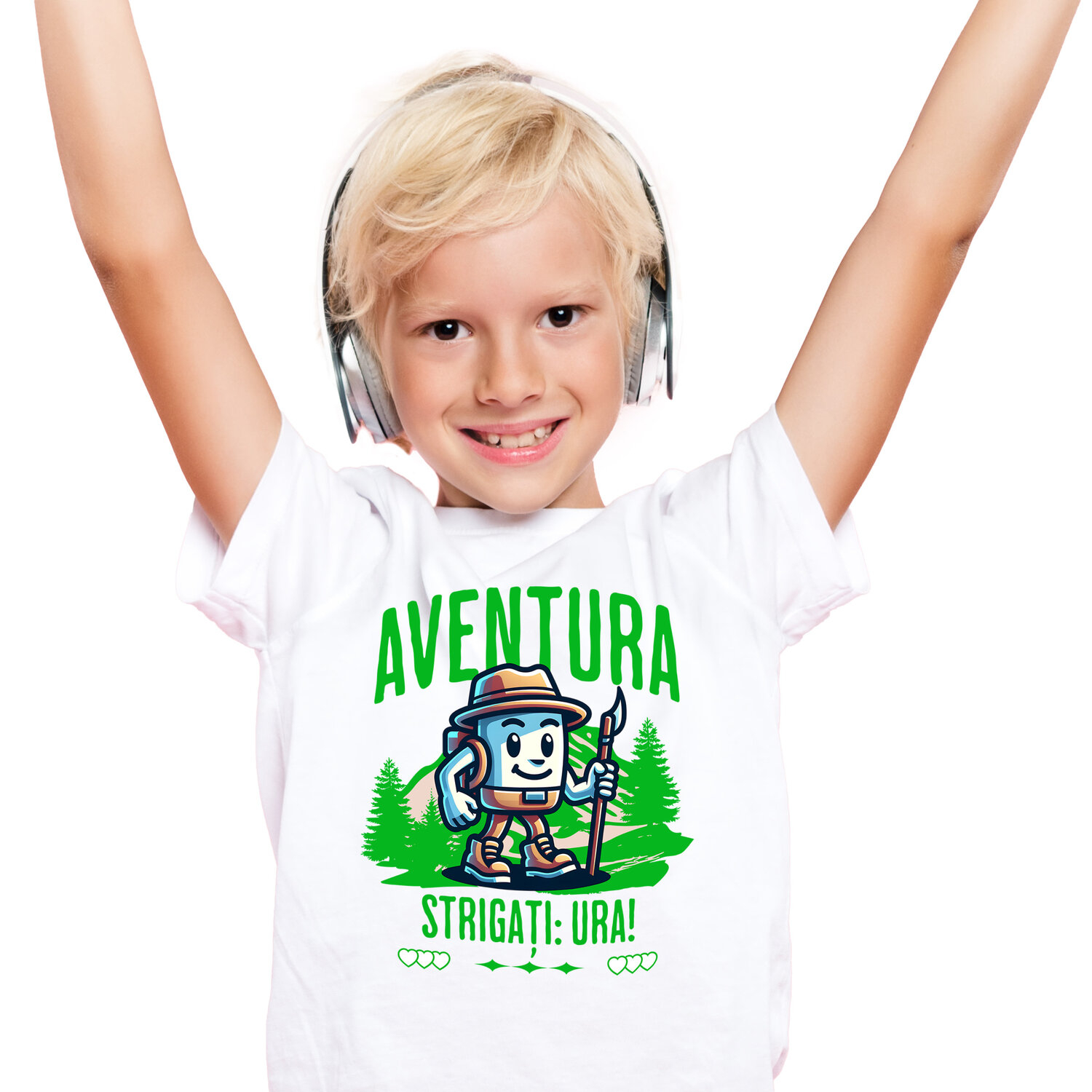 Tricou Copii cu Animatie Desene Calator In Padure Printre Munti Natura, Palarie Si Rucsac cu imprimeu pe Fata, 100% Bumbac, Alb, 10 Ani