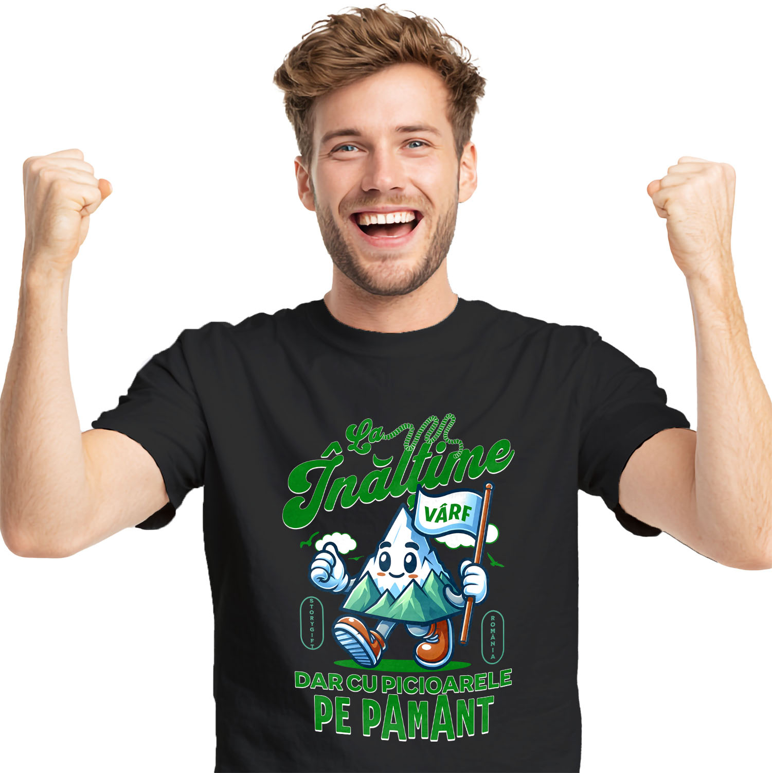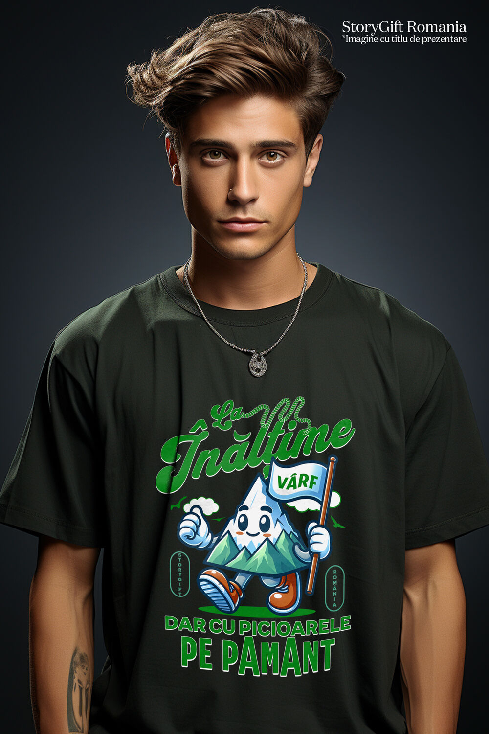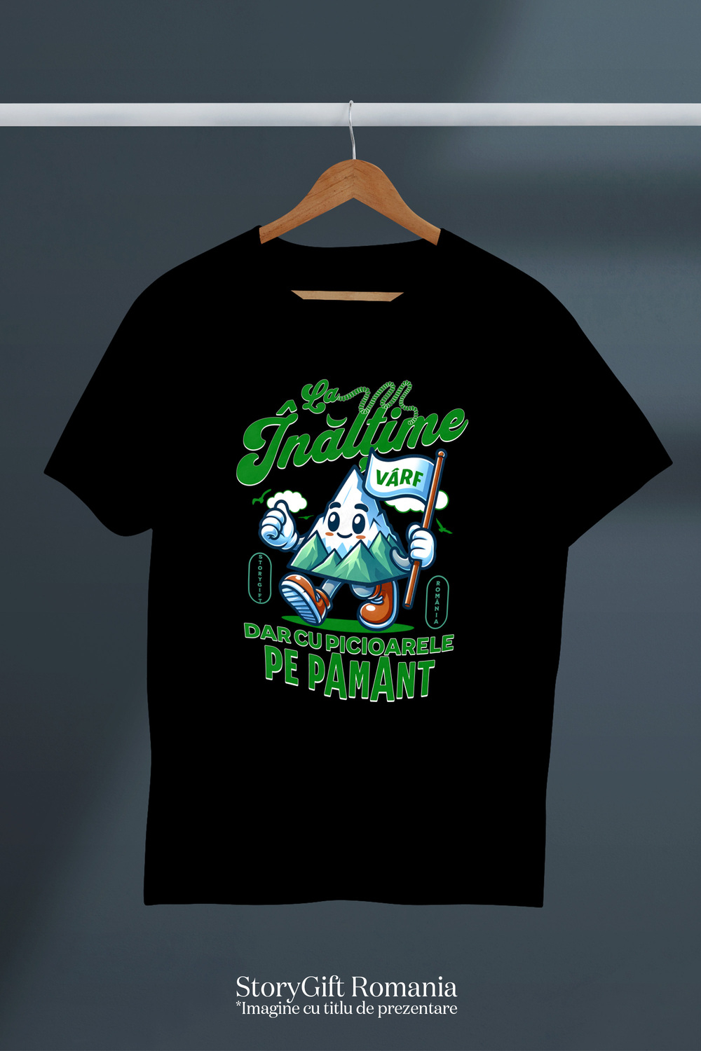 Tricou Barbati cu Animatie varf De Munte Vesel Cu Steag Alb Natura, Padure, Sport cu imprimeu pe Fata, 100% Bumbac, Negru, L