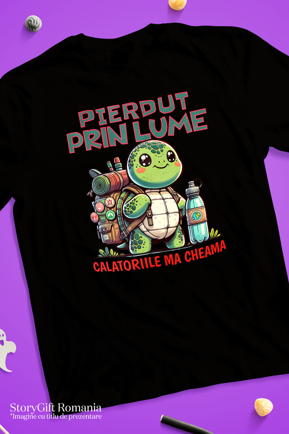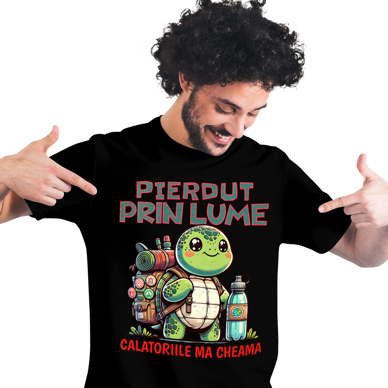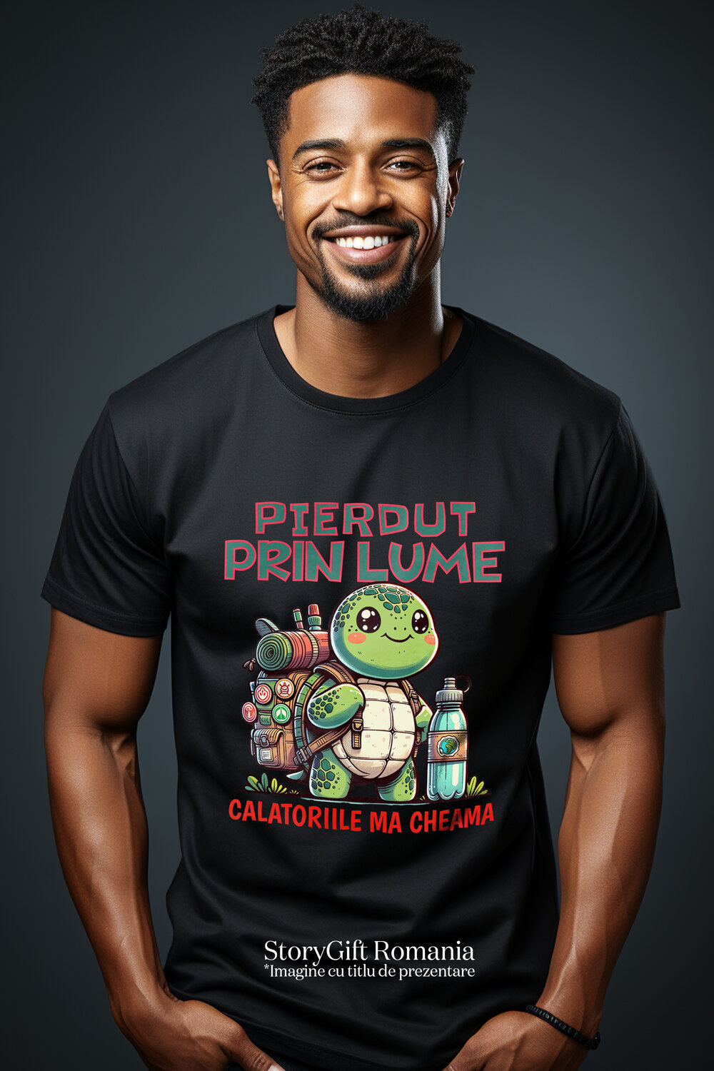 Tricou Barbati cu Broasca Testoasa Cu Rucsac Si Apa Gata dE Aventura calatoare, Munte, Natura cu imprimeu pe Fata, 100% Bumbac, Negru, L