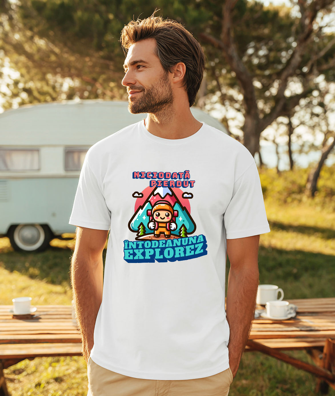 Tricou Barbati cu Calator Printre Munti Cu Rucsac Gata De Aventura Natura Padure cu imprimeu pe Fata, 100% Bumbac, Alb, M