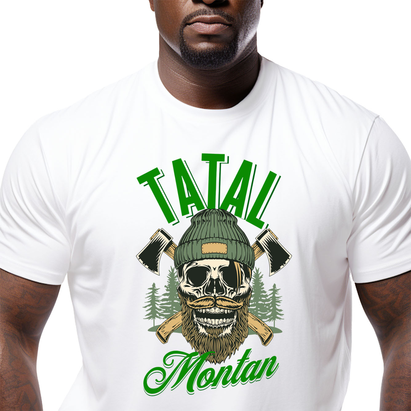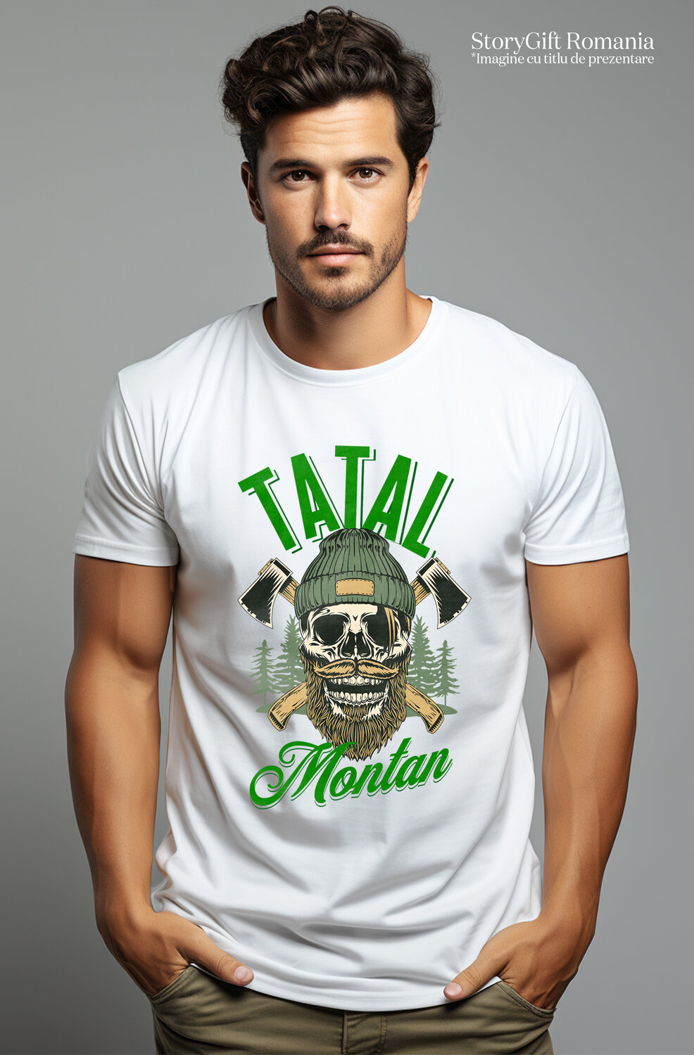 Tricou Barbati cu Craniu Uman mort Cu Barba Si Mustata, caciula, Topoare Padure Hobby cu imprimeu pe Fata, 100% Bumbac, Alb, M