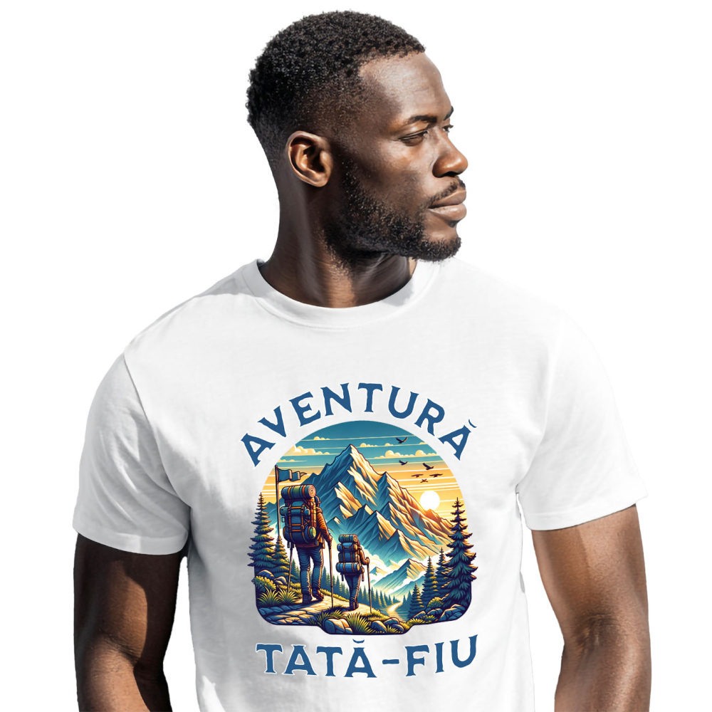 Tricou Barbati cu Cuplu Sportiv Prin Munti Cu Rcsace Natura, natura, Rasarit De Soare, Hobby cu imprimeu pe Fata, 100% Bumbac, Alb, M