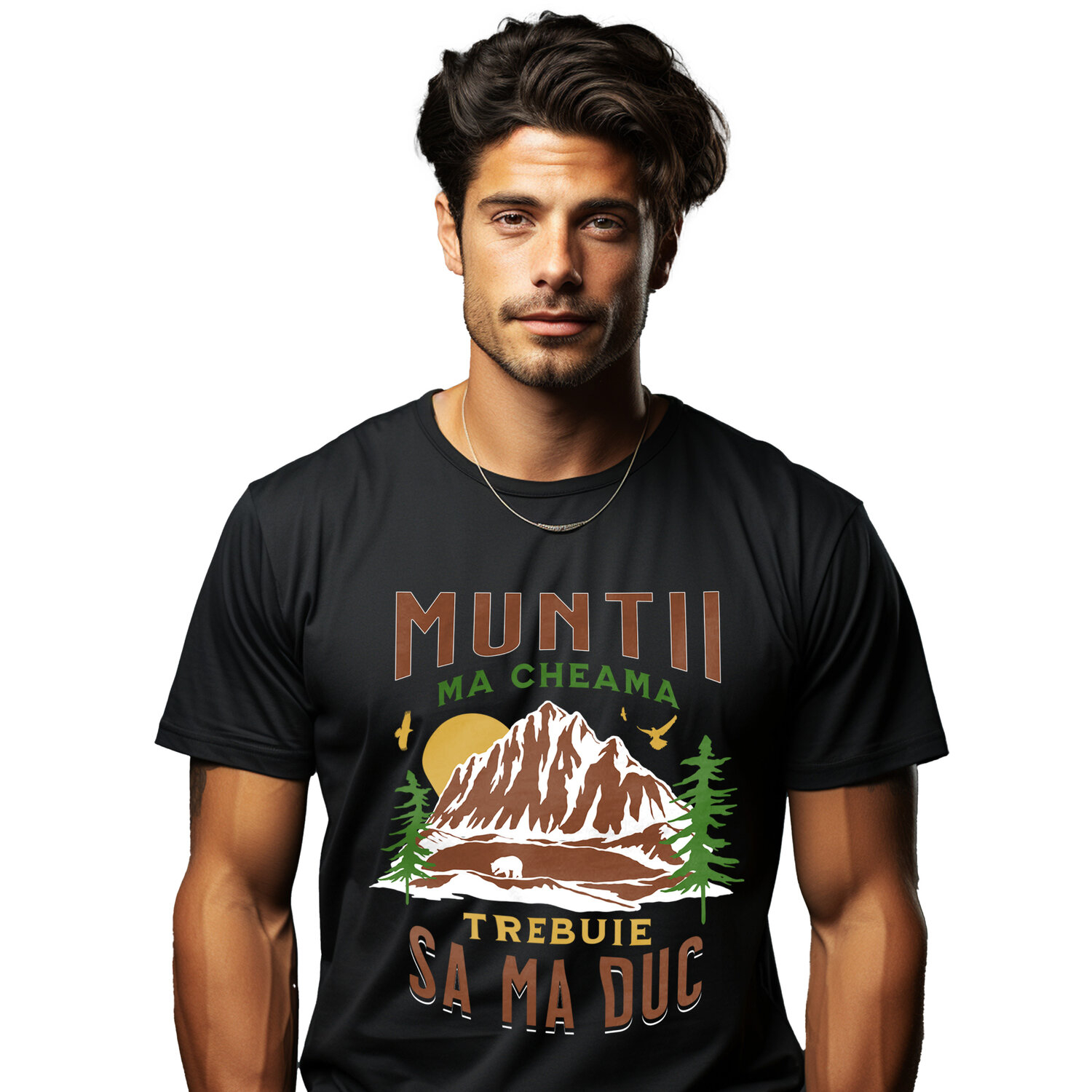 Tricou Barbati cu Iubitorii De Munte Si Aventura, Padure, Animale Salbatice Urs, Vulturi cu imprimeu pe Fata, 100% Bumbac, Negru, L