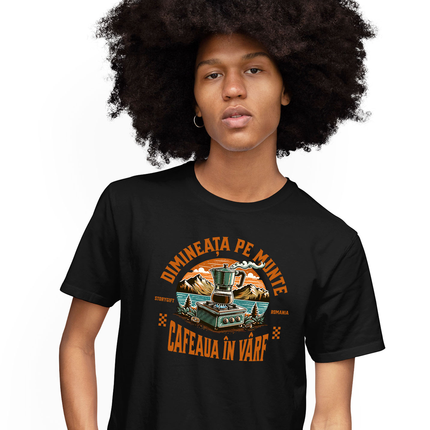 Tricou Barbati cu Iubitorii de View Montan Cu Cafea Lac Stralucitor, Aventura, Natura cu imprimeu pe Fata, 100% Bumbac, Negru, L