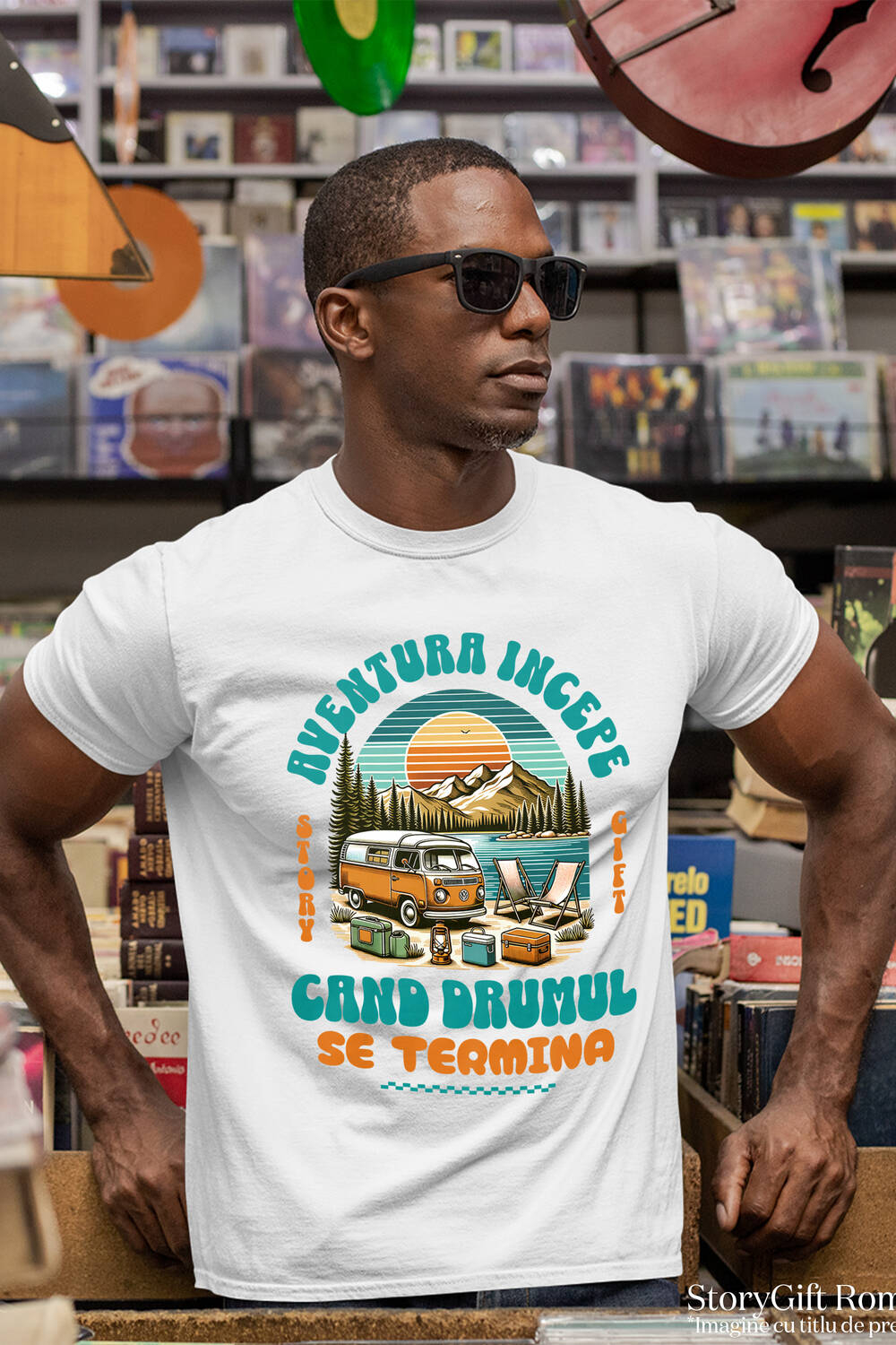 Tricou Barbati cu Plimbare Cu Rulota Intre Munti, Apus Soare Lac Stralucitor Padure, familie, Relaxare cu imprimeu pe Fata, 100% Bumbac, Alb, L