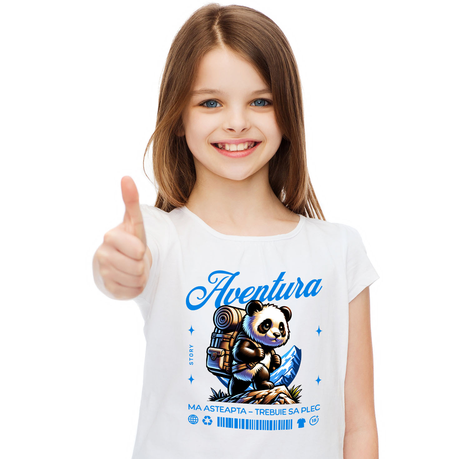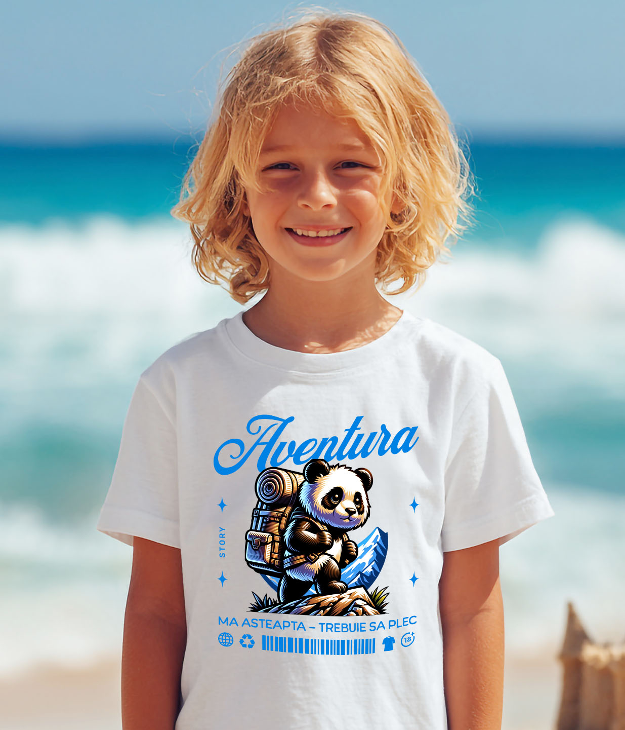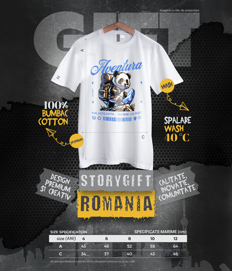 Tricou Copii cu Urs Panda Cu Rucsac Imens Pe Munte, Natura, Aventura, Animal Blanos cu imprimeu pe Fata, 100% Bumbac, Alb, 12 Ani