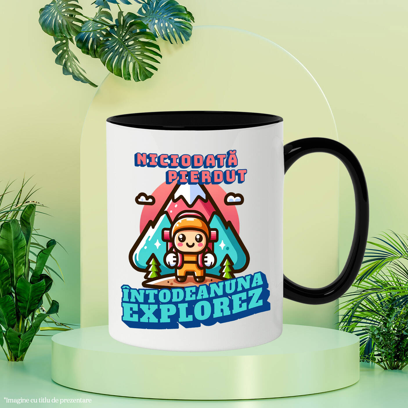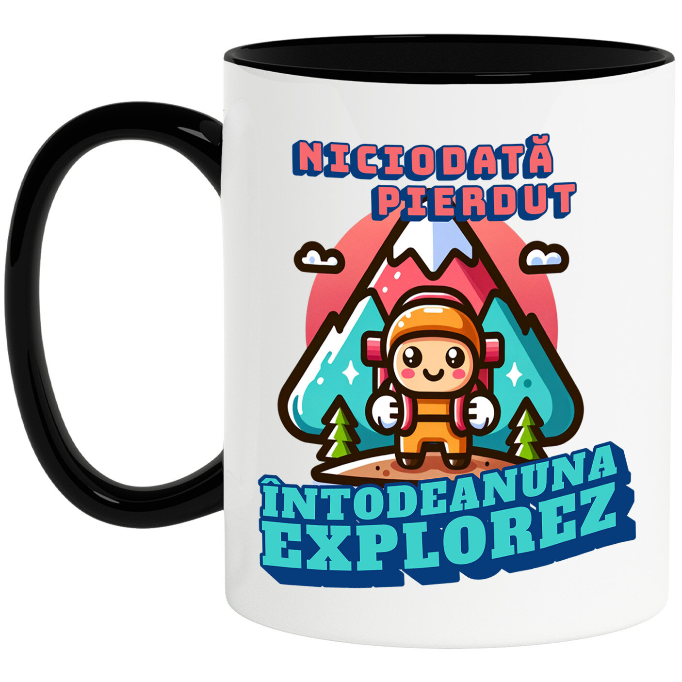 Cana Personalizata cu Calator Printre Munti Cu Rucsac Gata De Aventura Natura Padure, Ceramica, 330ML, cu Maner Negru