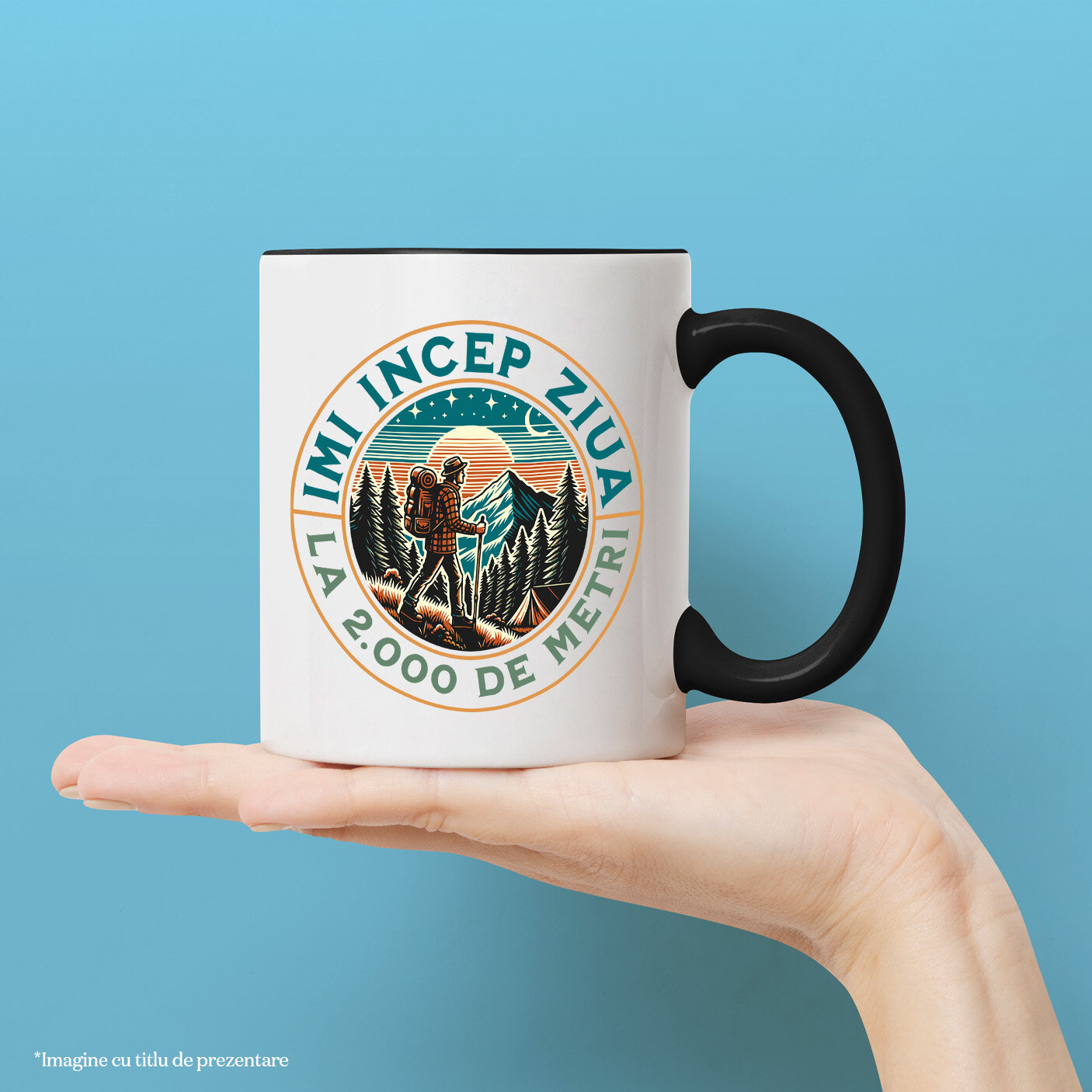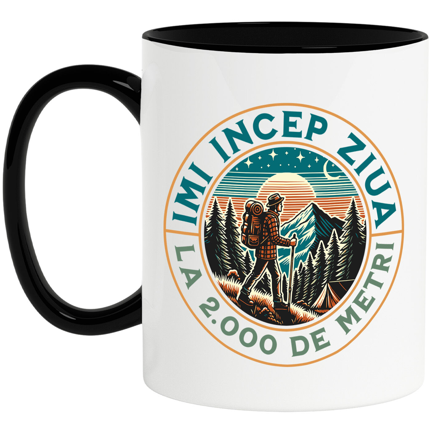 Cana Personalizata cu Iubitorii de calatorii si drumeti in varful muntelui cu ghiozdanul , Ceramica, 330ML, cu Maner Negru