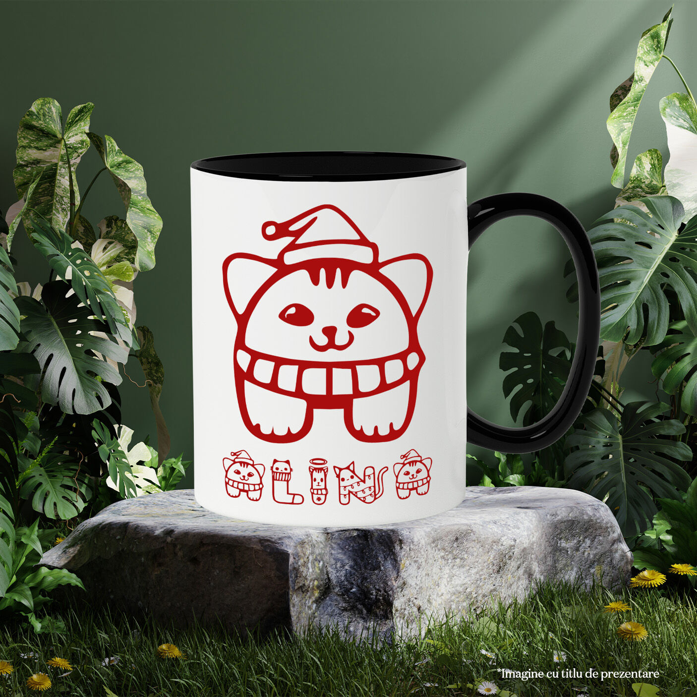 Cana Iubitorii De Craciun, Caine Cu Fular Si Caciula, Text Nume Personalizat, Culoare Rosu, Cu Litera, 330ML, Ceramica, Cu Maner si Interior Negru