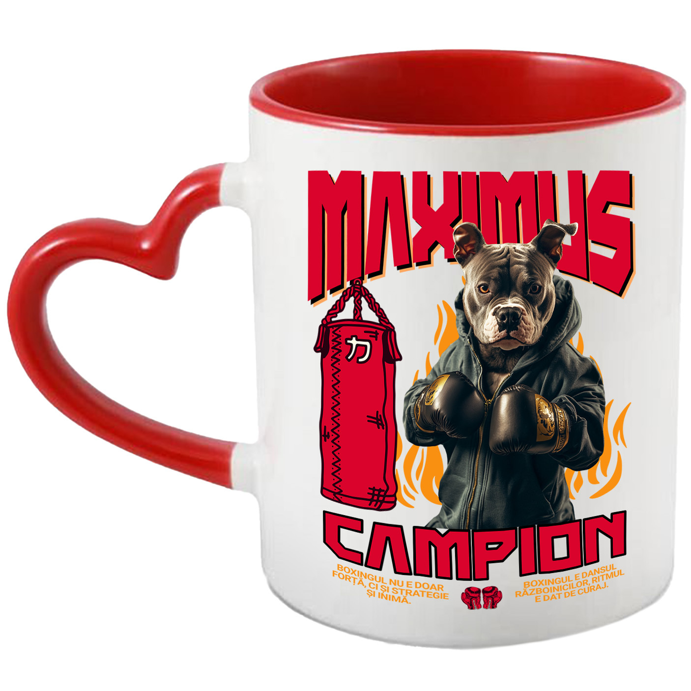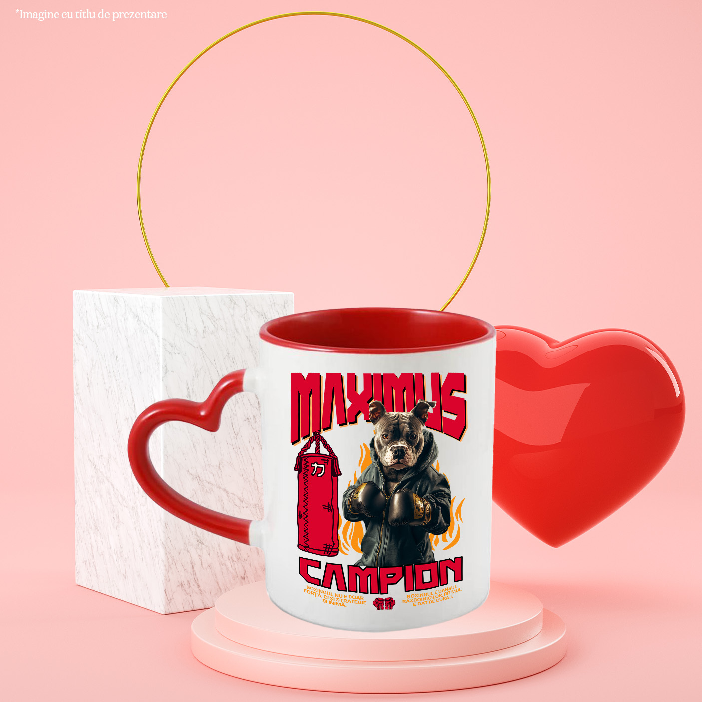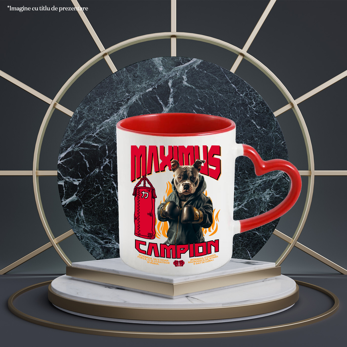 Cana cu Animal Boxer In Hanorac, Sac de Box, Flacari, Peronalizata cu Numele si Poza Animalului Tau cu Maner Inima Rosie