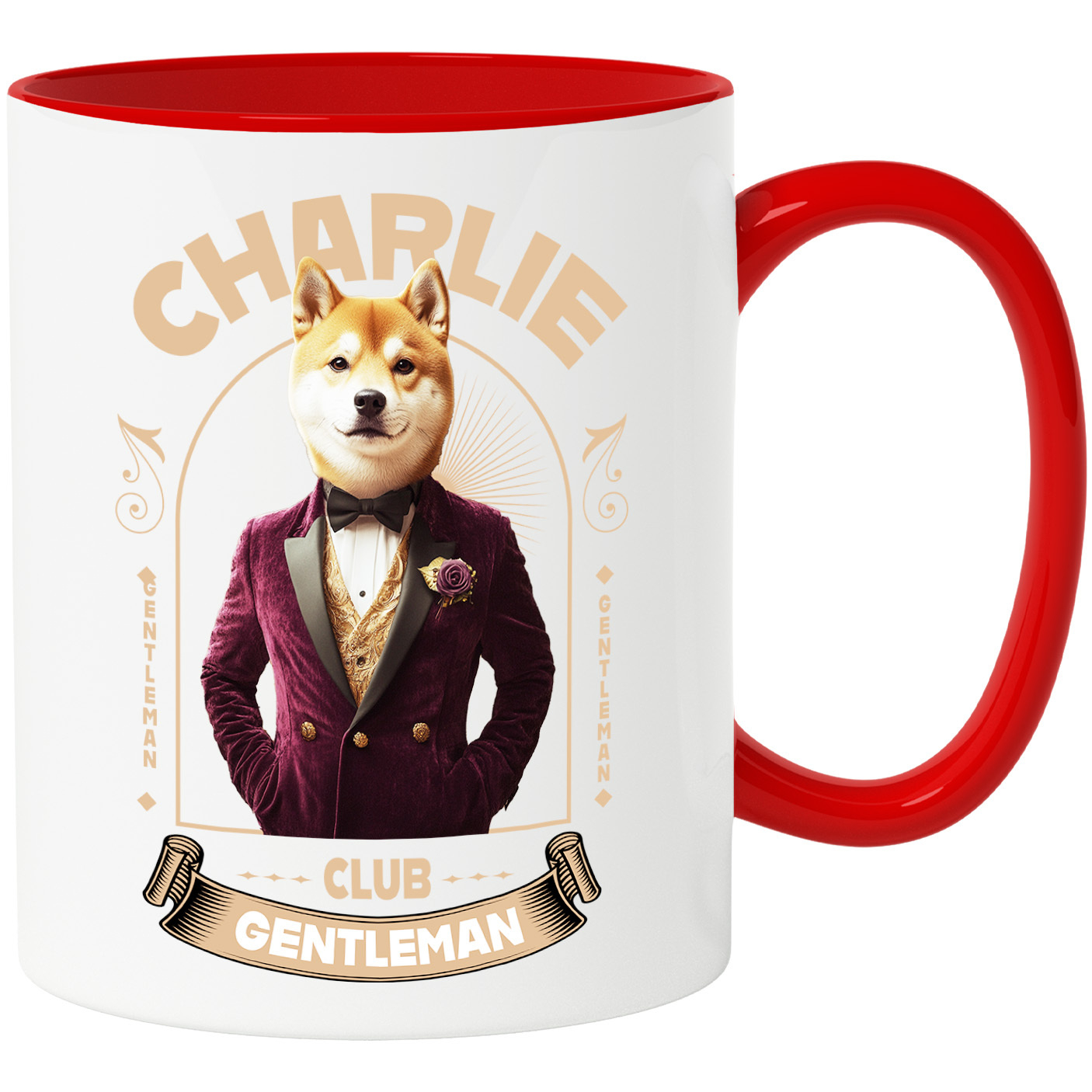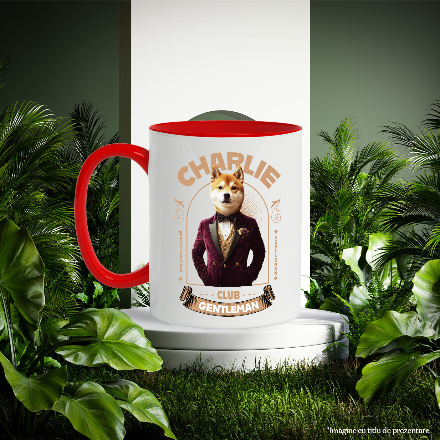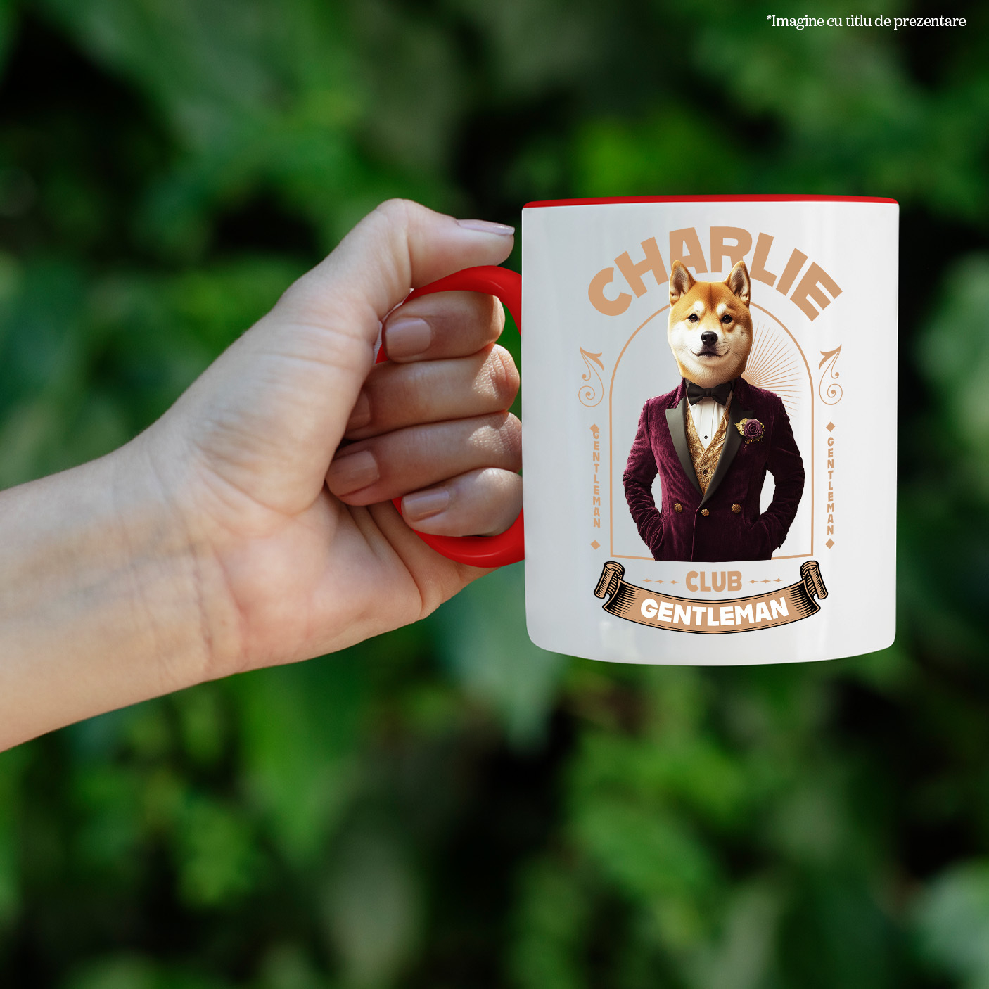 Cana cu Animal Gentleman in Costum, Camasa, Papion si Floare Trandfir, Peronalizata cu Numele si Poza Animalului Tau cu Maner Rosu