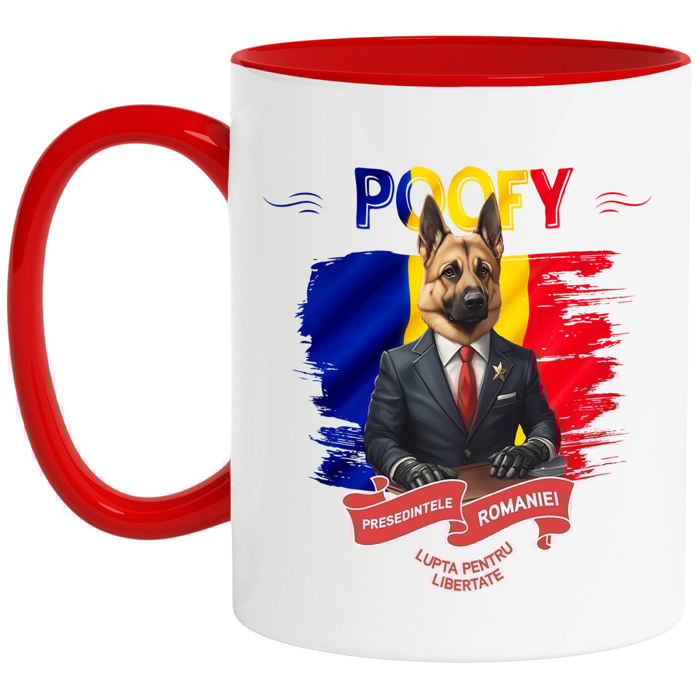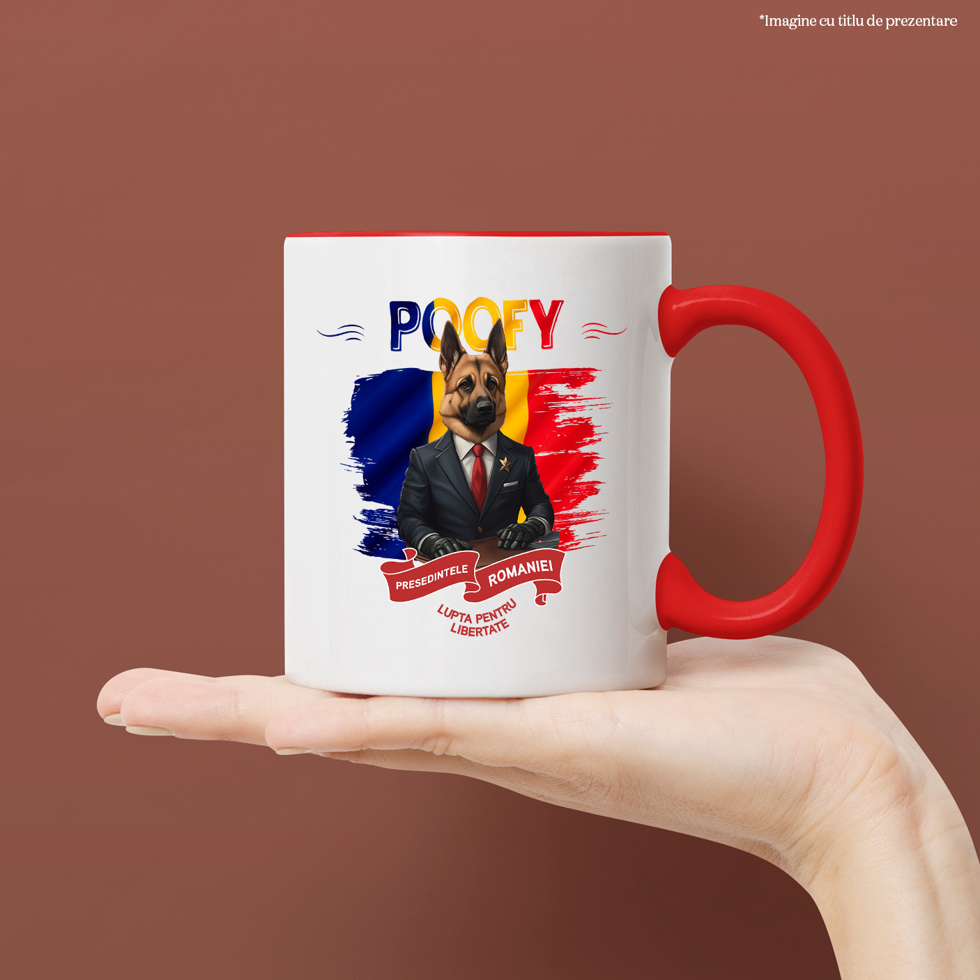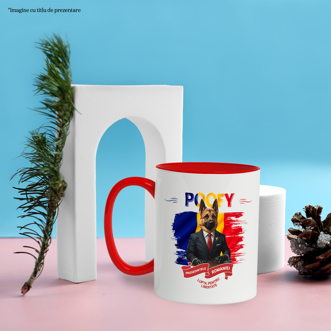 Cana cu Animal In Costum de Presedinte, Steagul Romaniei, Peronalizata cu Numele si Poza Animalului Tau cu Maner Rosu