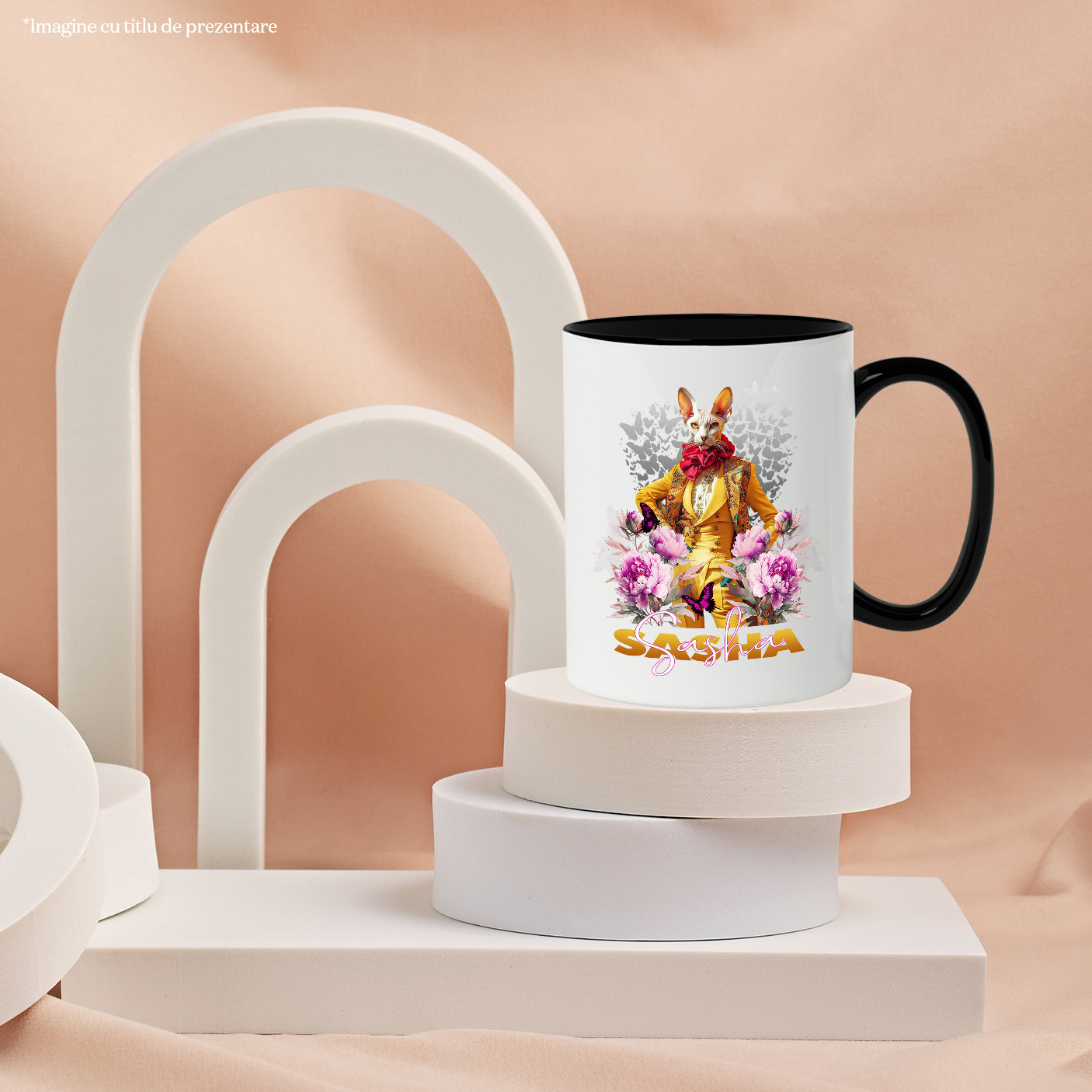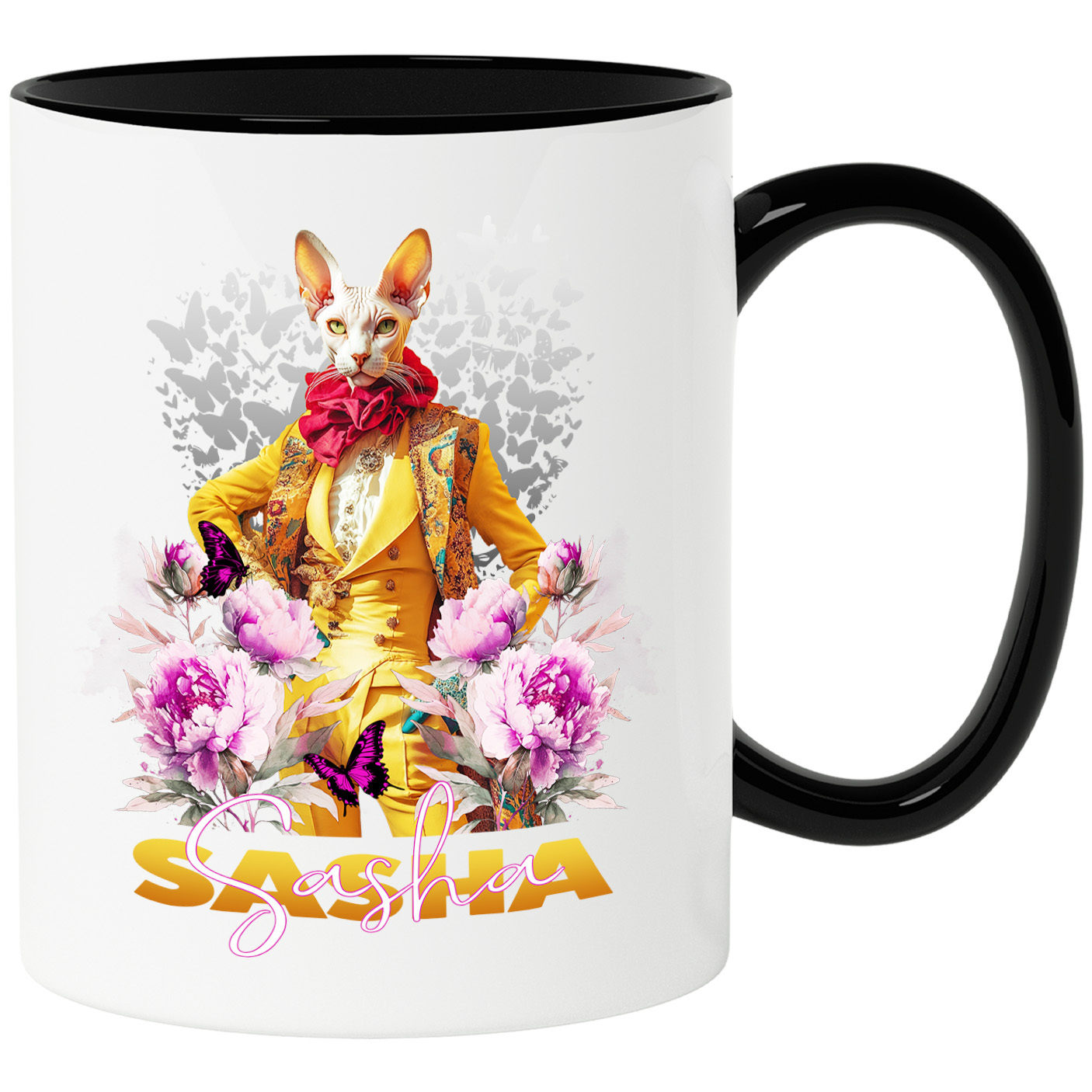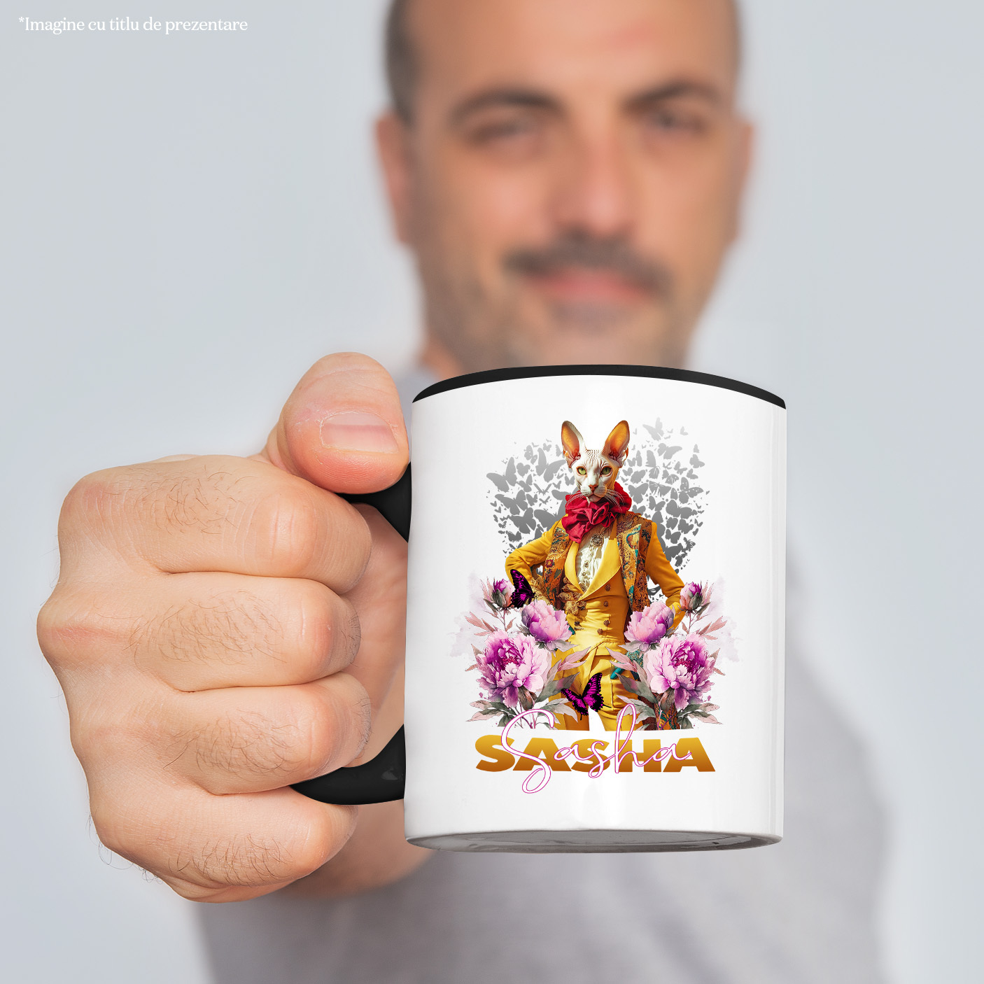 Cana cu Animal La Moda in Costum Galben, Inconjurat de Flori, Peronalizata cu Numele si Poza Animalului Tau cu Maner Negru