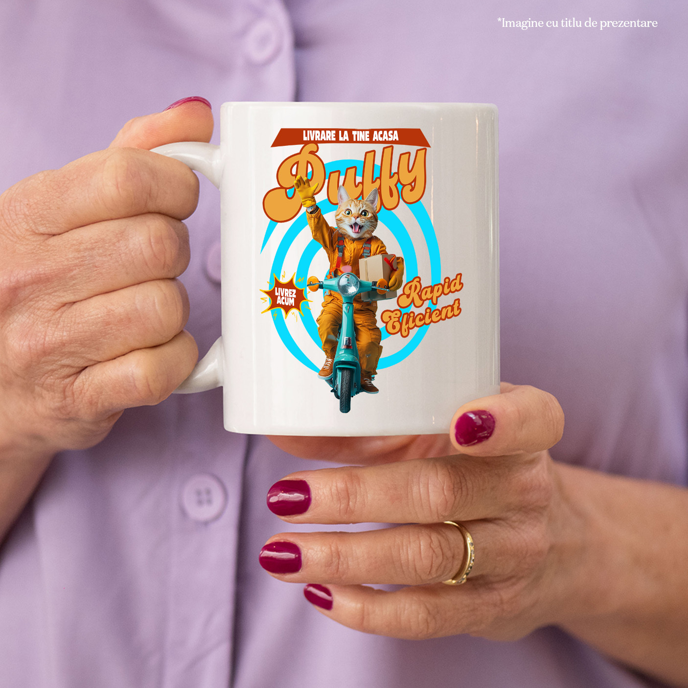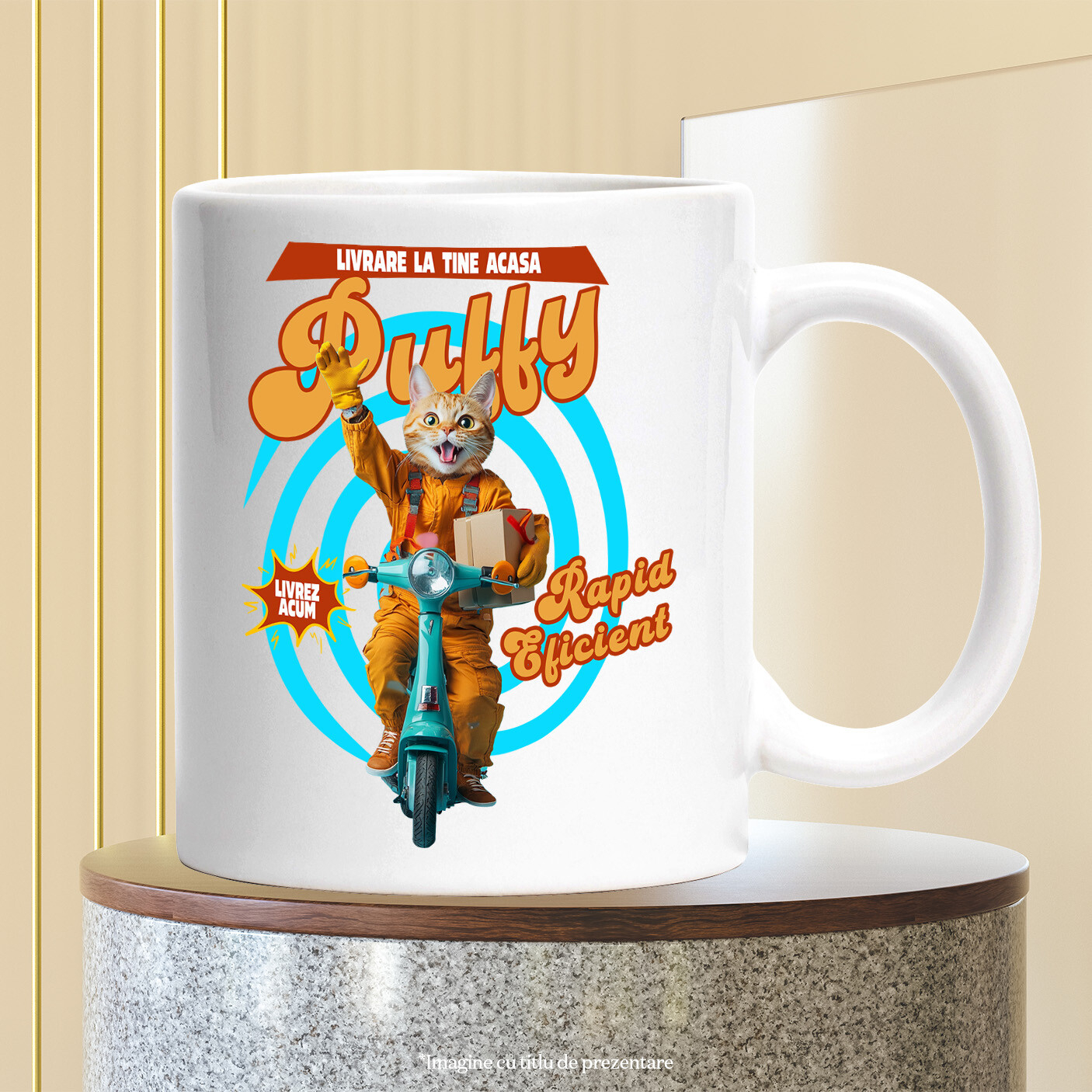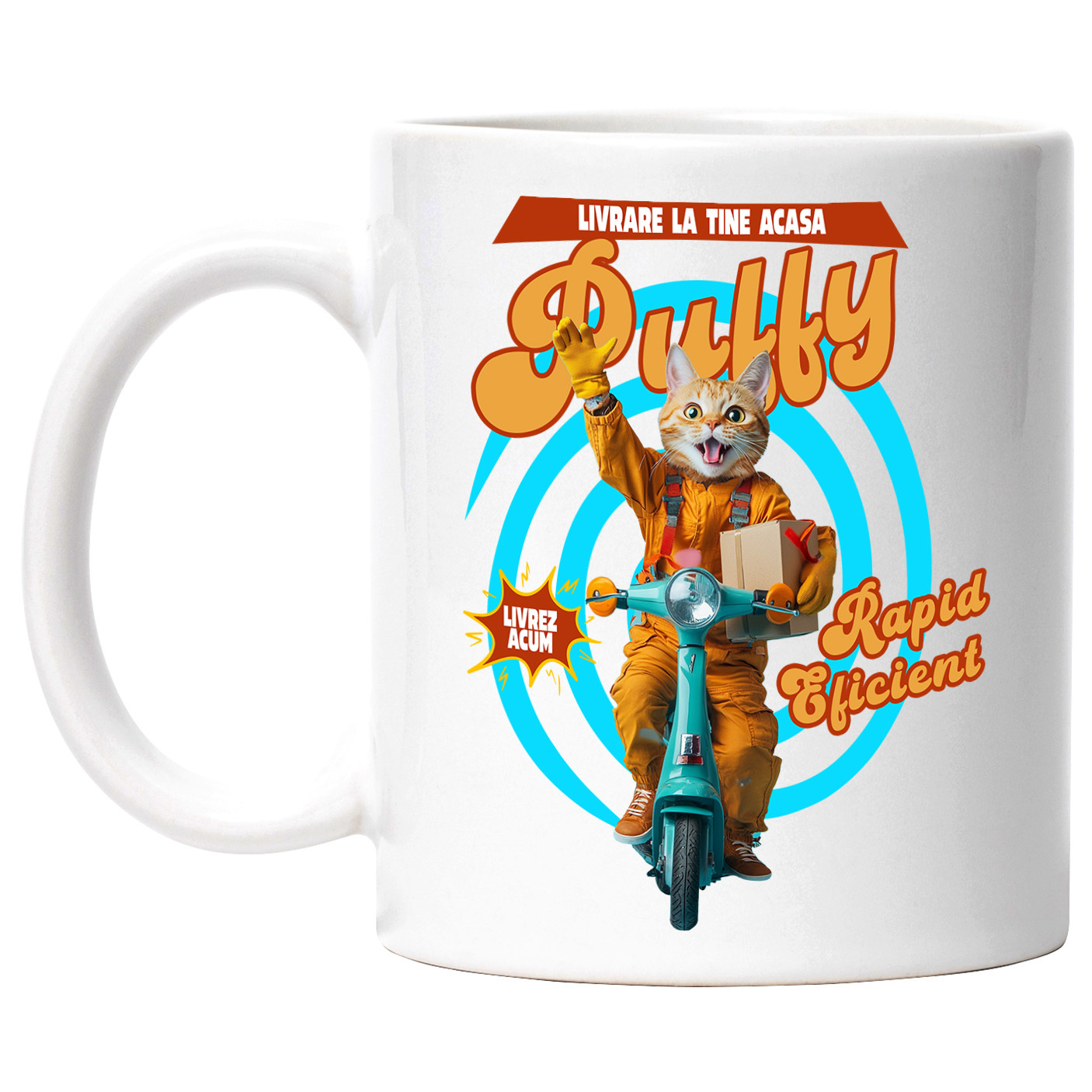 Cana cu Animal Livrator de Colete pe Scooter, Peronalizata cu Numele si Poza Animalului Tau cu Maner Alb