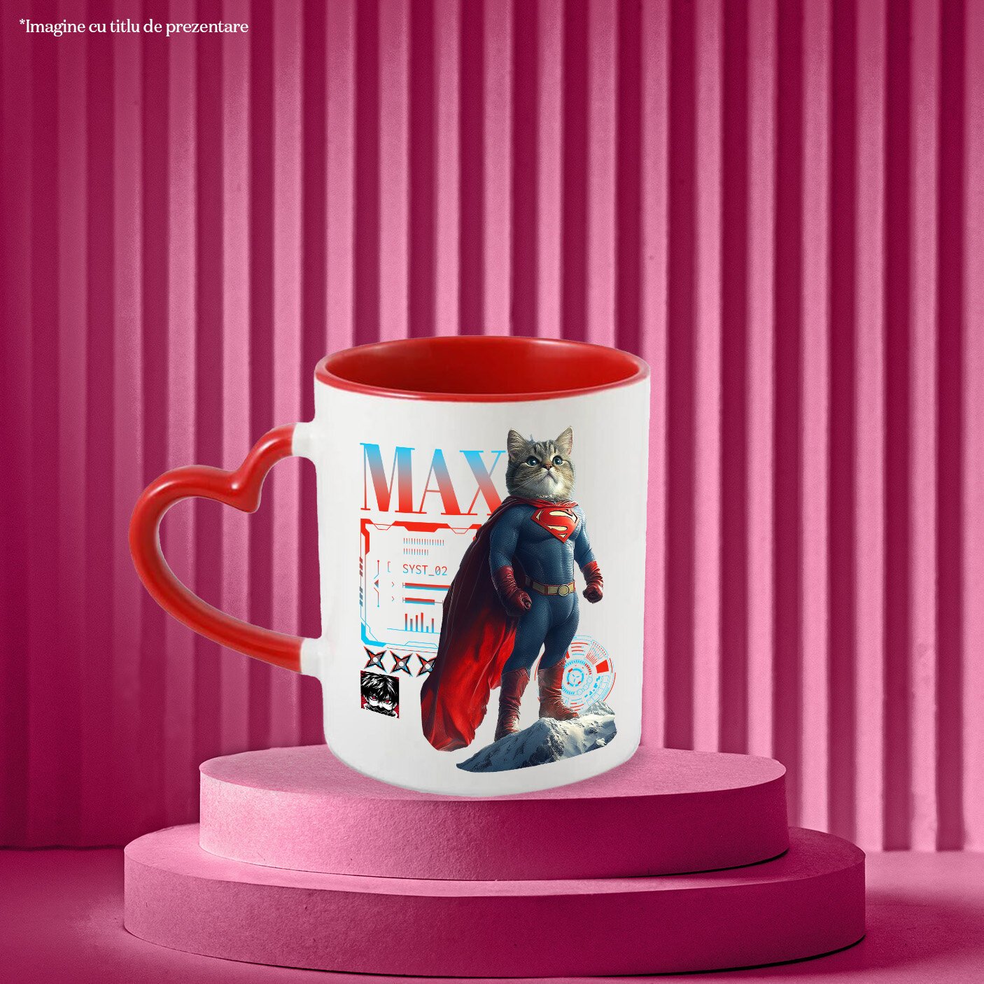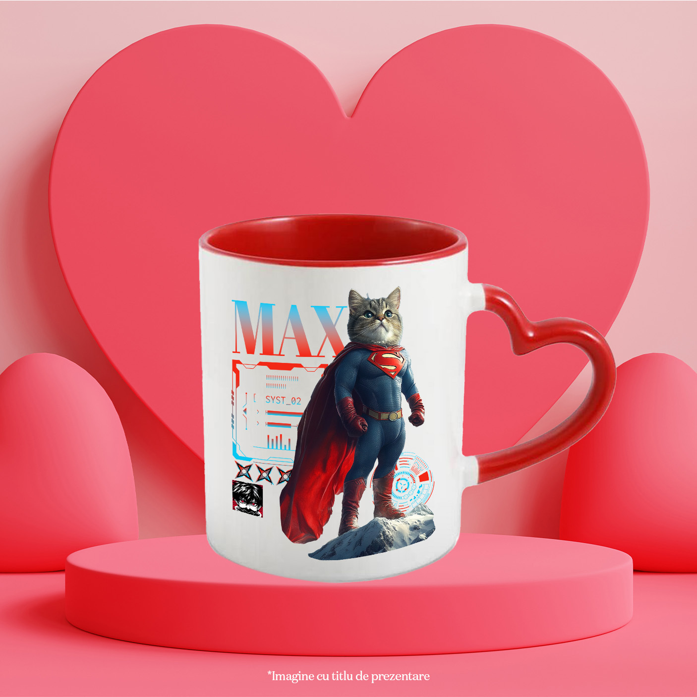 Cana cu Animal SuperMan in Varful Muntelui, Power Pose, Peronalizata cu Numele si Poza Animalului Tau cu Maner Inima Rosie