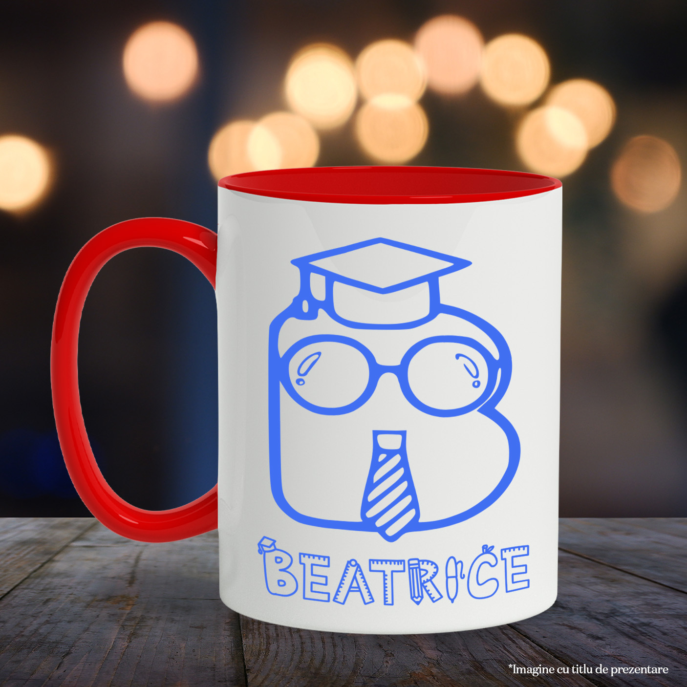 Cana Absolvire scoala, Toca Educatie, Text Nume Personalizat, copii, Culoare Albastru, Cu Litera, 330ML, Ceramica, Cu Maner si Interior Rosu