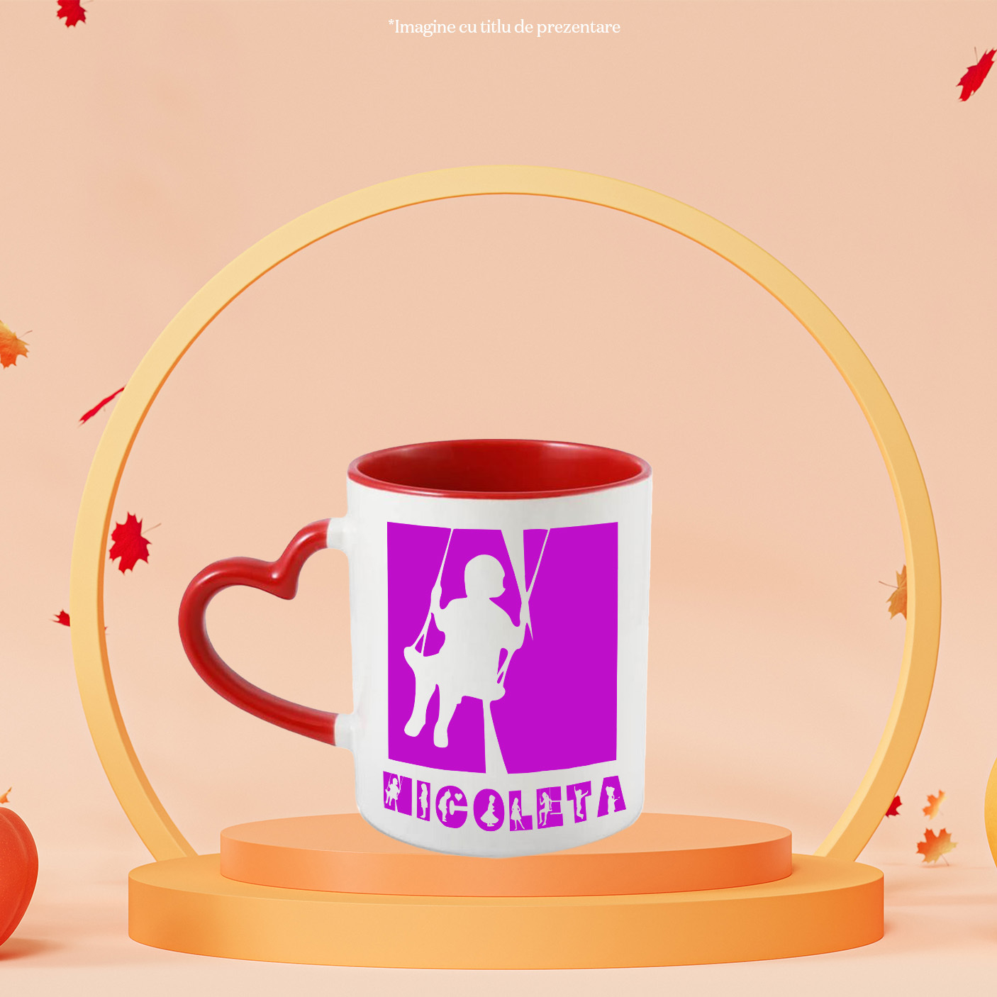 Cana Iubitorii De Copii, Siluete Diverse, Text Nume Personalizat, Parinte, Culoare Mov, Cu Litera, 330ML, Ceramica, Cu Maner Inima Rosie si Interior Rosu