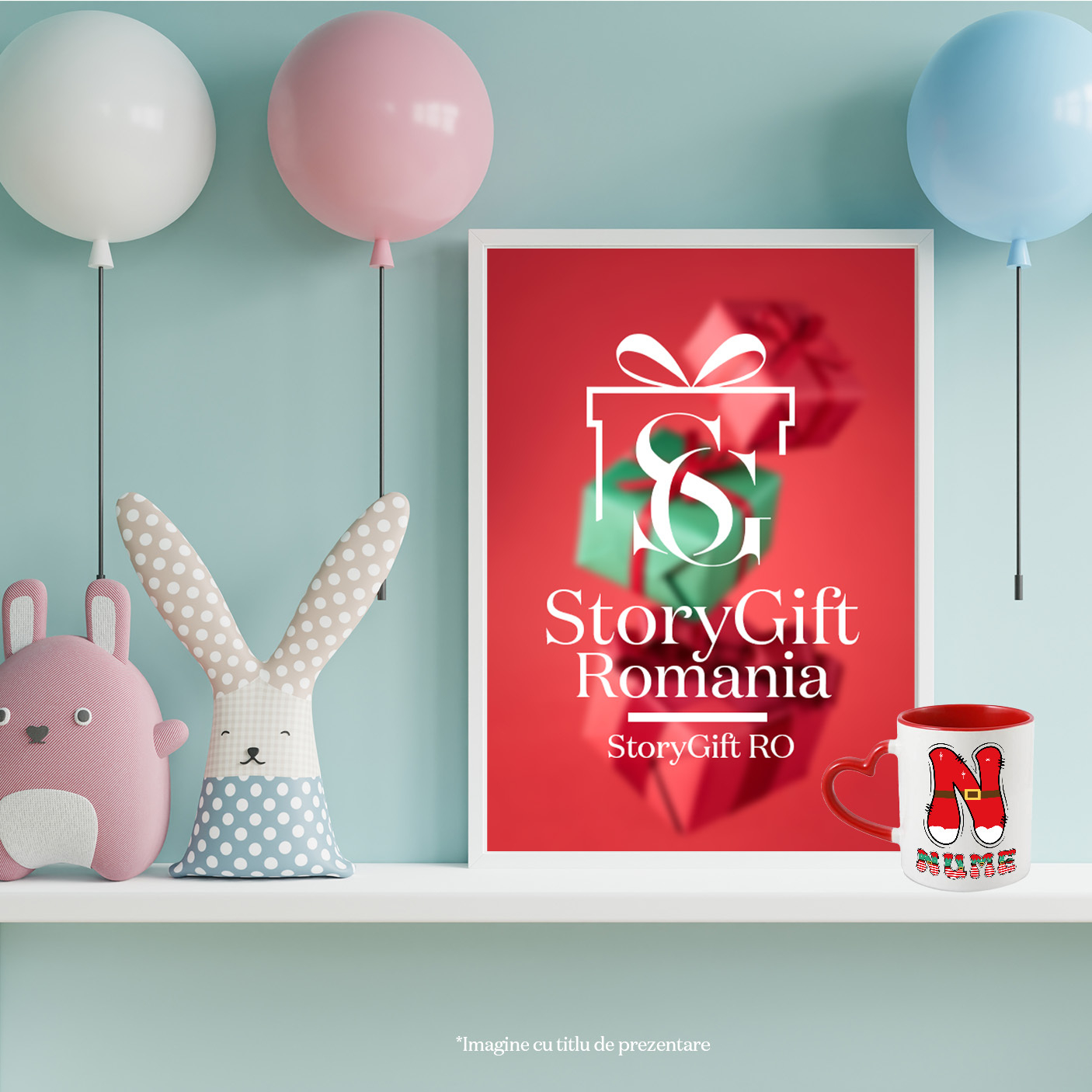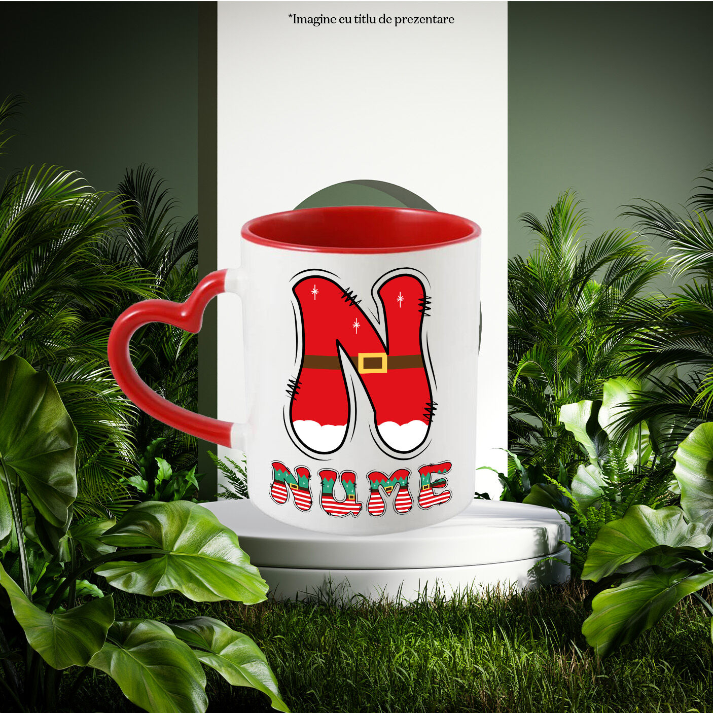 Cana Iubitorii De Craciun, Mos Craciun, Text Nume Personalizat, Copii, Culoare Rosu, alb, Verde, Cu Litera, 330ML, Ceramica, Cu Maner Inima Rosie si Interior Rosu