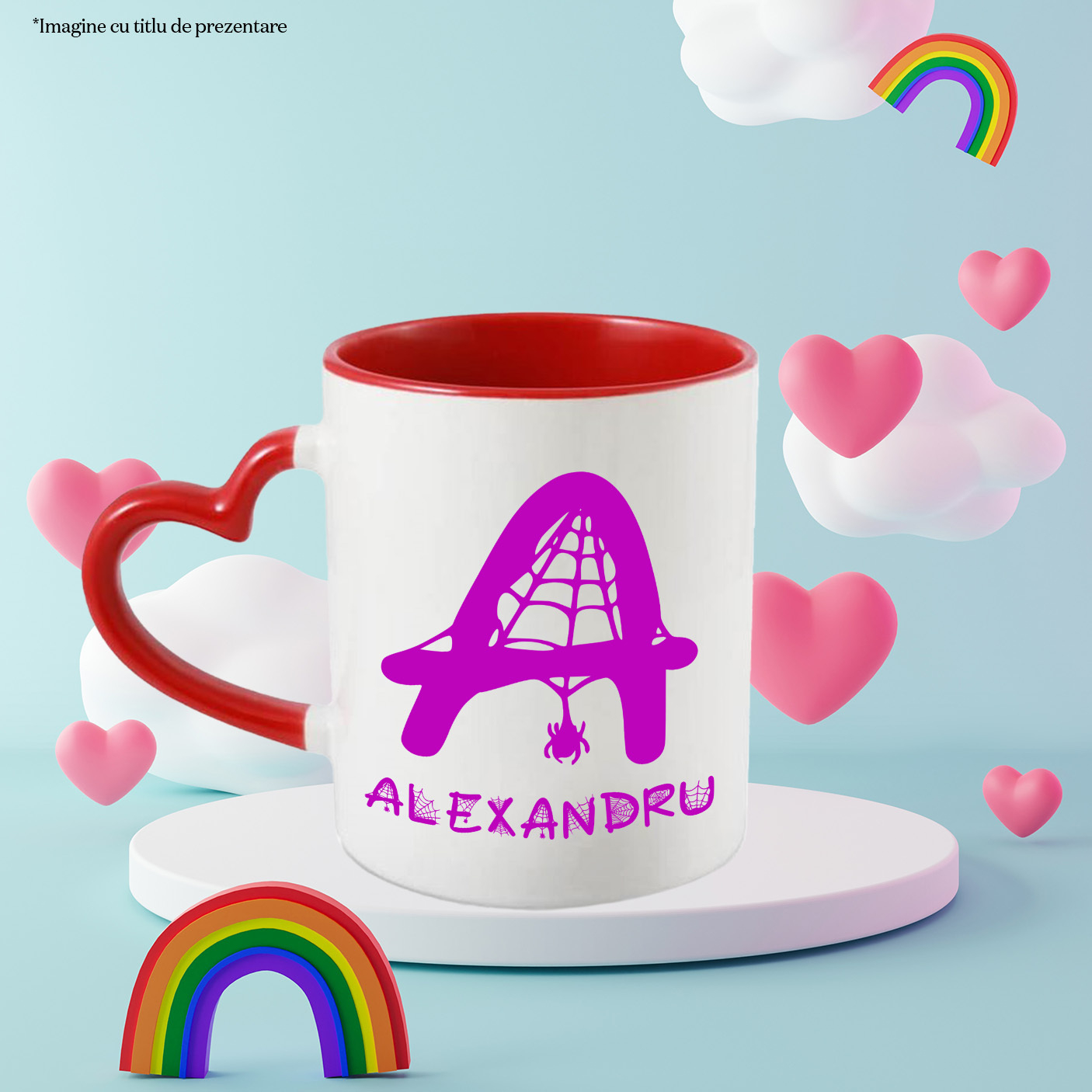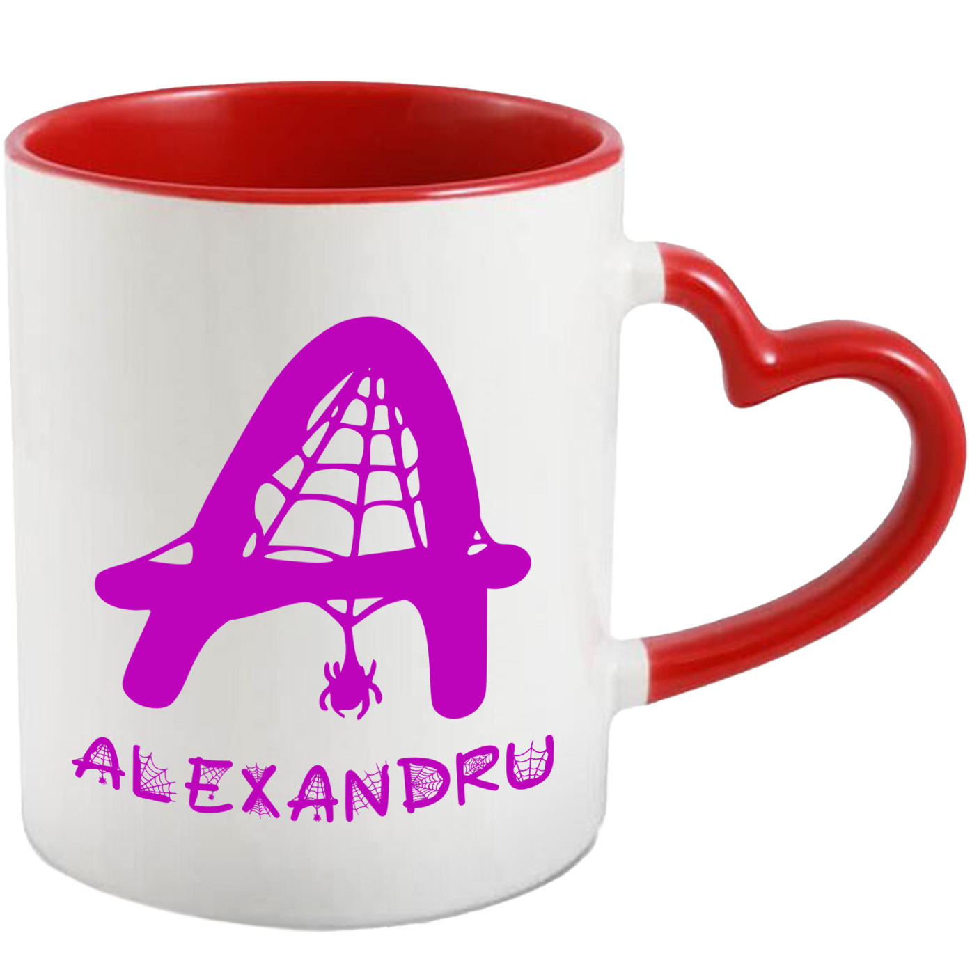Cana Iubitorii De Hallowen, Panza De Paianjen, Text Nume Personalizat, Copii, Culoare Mov, Cu Litera, 330ML, Ceramica, Cu Maner Inima Rosie si Interior Rosu