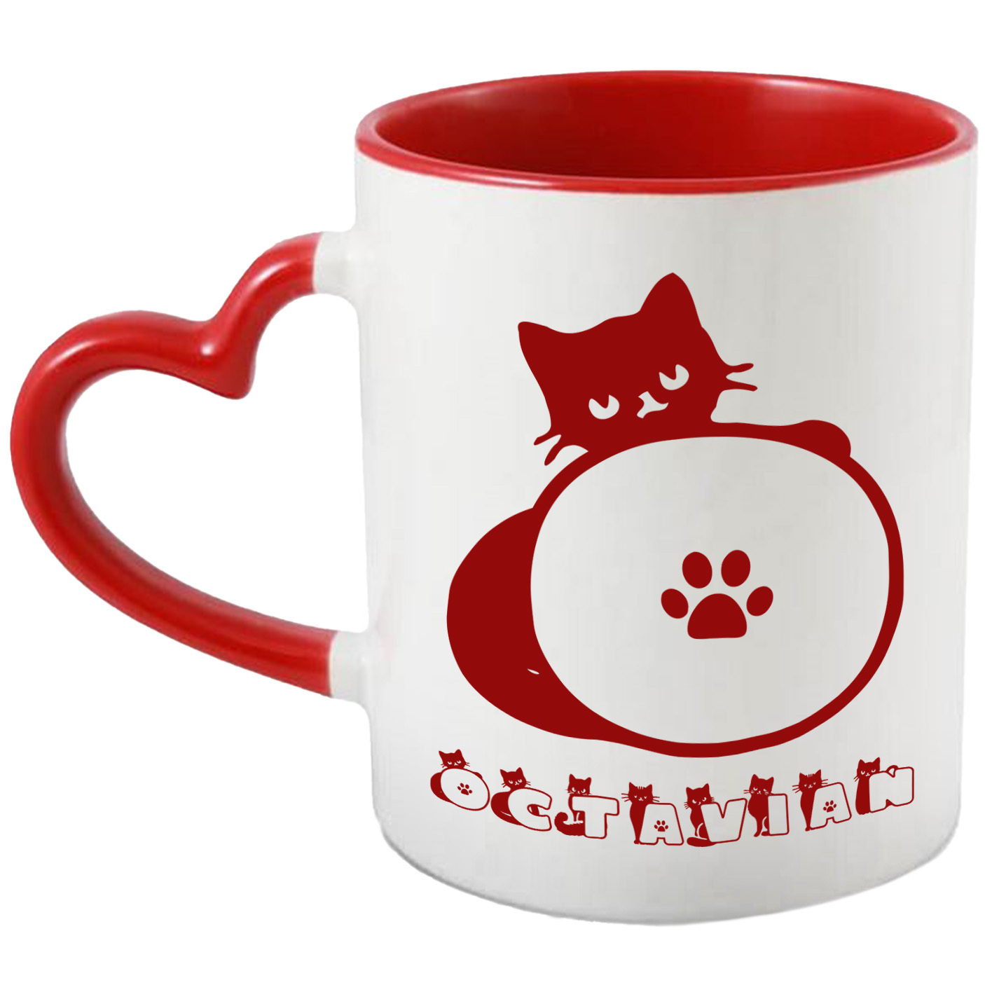 Cana Iubitorii De Pisici, Animal Pufos, Text Nume Personalizat, Culoare Rosu, Cu Litera, 330ML, Ceramica, Cu Maner Inima Rosie si Interior Rosu