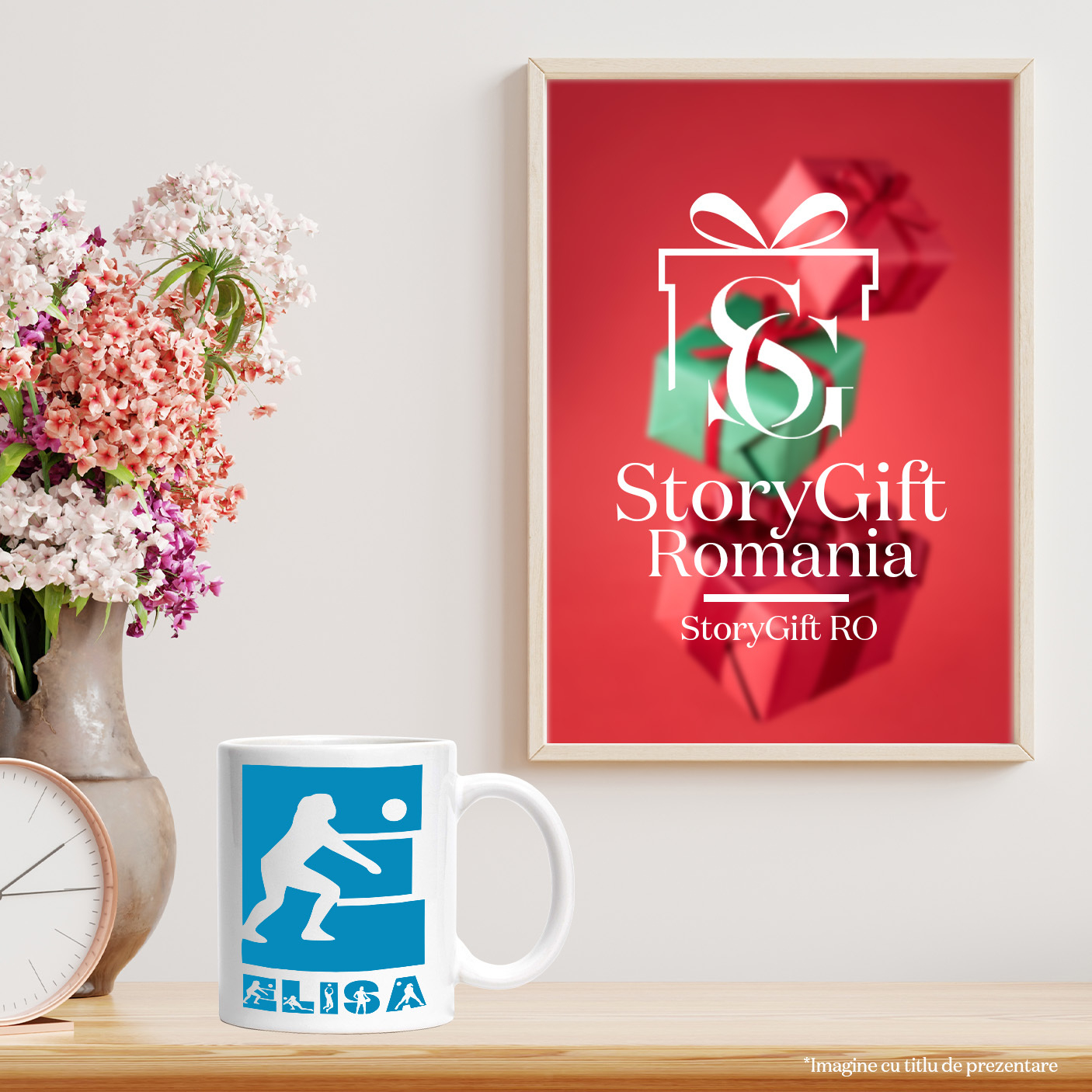 Cana Iubitorii De Volei, Silueta Sportiva, Text Nume Personalizat, Copii, Culoare Albastru, Cu Litera, 330ML, Ceramica, Cu Maner si Interior Alb
