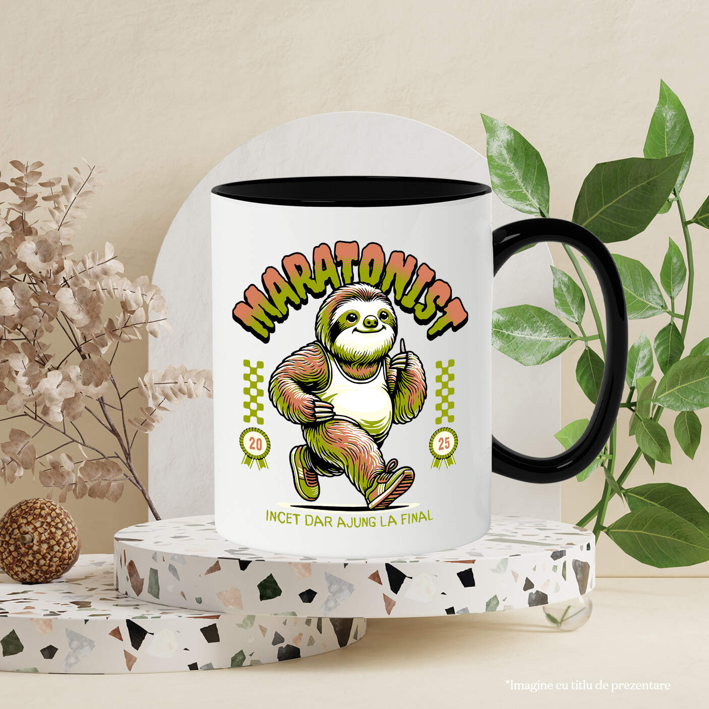 Cana Personalizata cu Animal Lenes Gras Alergand Maratonist Incet Haios Sport, Ceramica, 330ML, cu Maner Negru