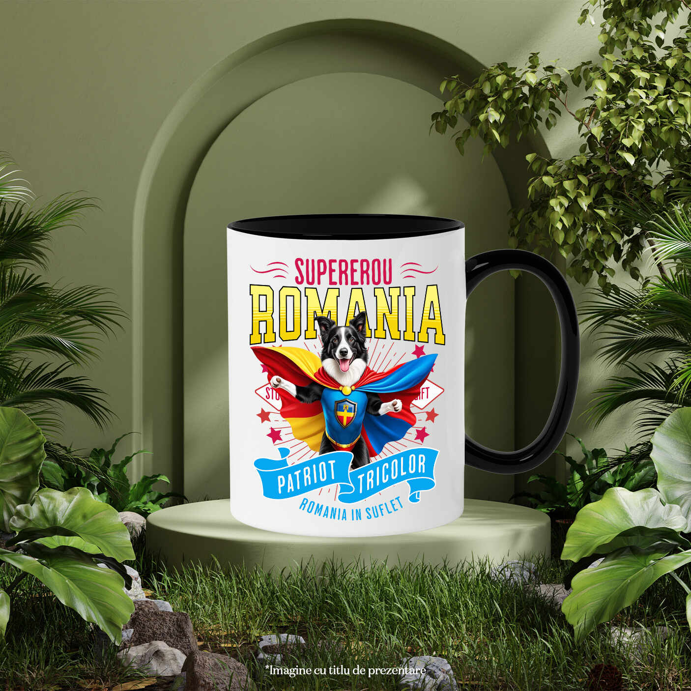 Cana Personalizata cu Border Collie Caine In Costum de Capitan Romania cu Pelerina, Erou Nocturn, Desene animate, Copii, Iubitorii de Animale, Ceramica, 330ML, cu Maner Negru