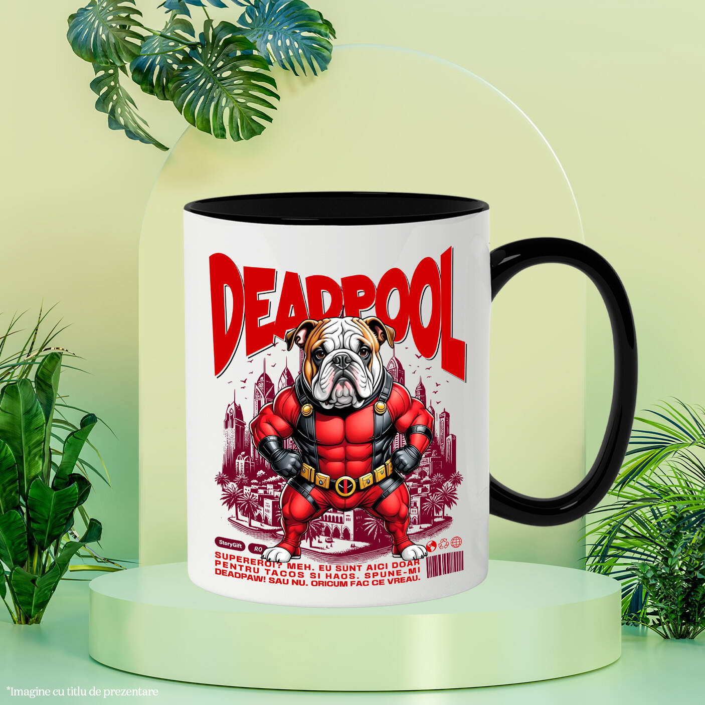 Cana Personalizata cu Bulldog Caine In Costum de DeadPool cu Pelerina, Erou Nocturn, Desene animate, Copii, Iubitorii de Animale, Ceramica, 330ML, cu Maner Negru