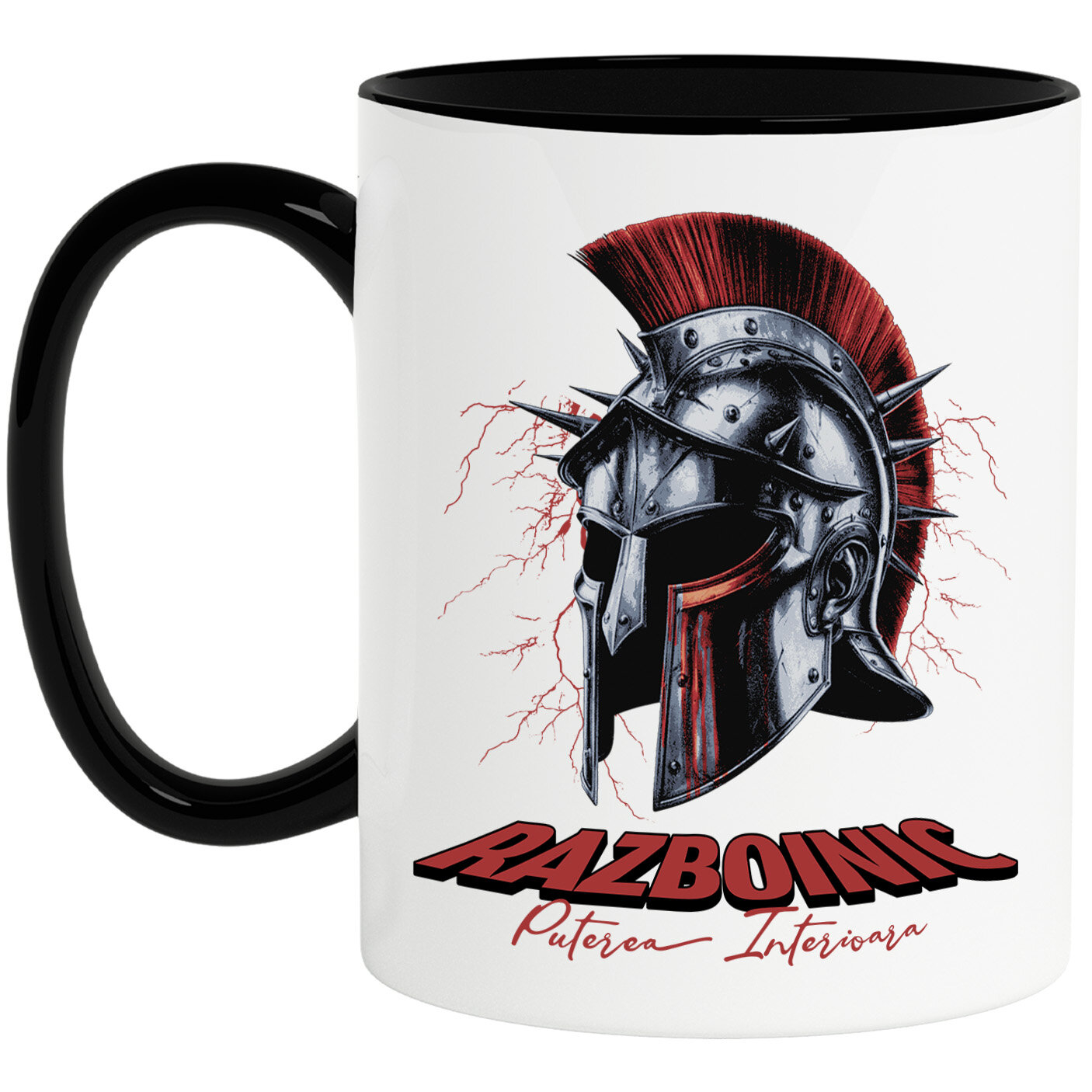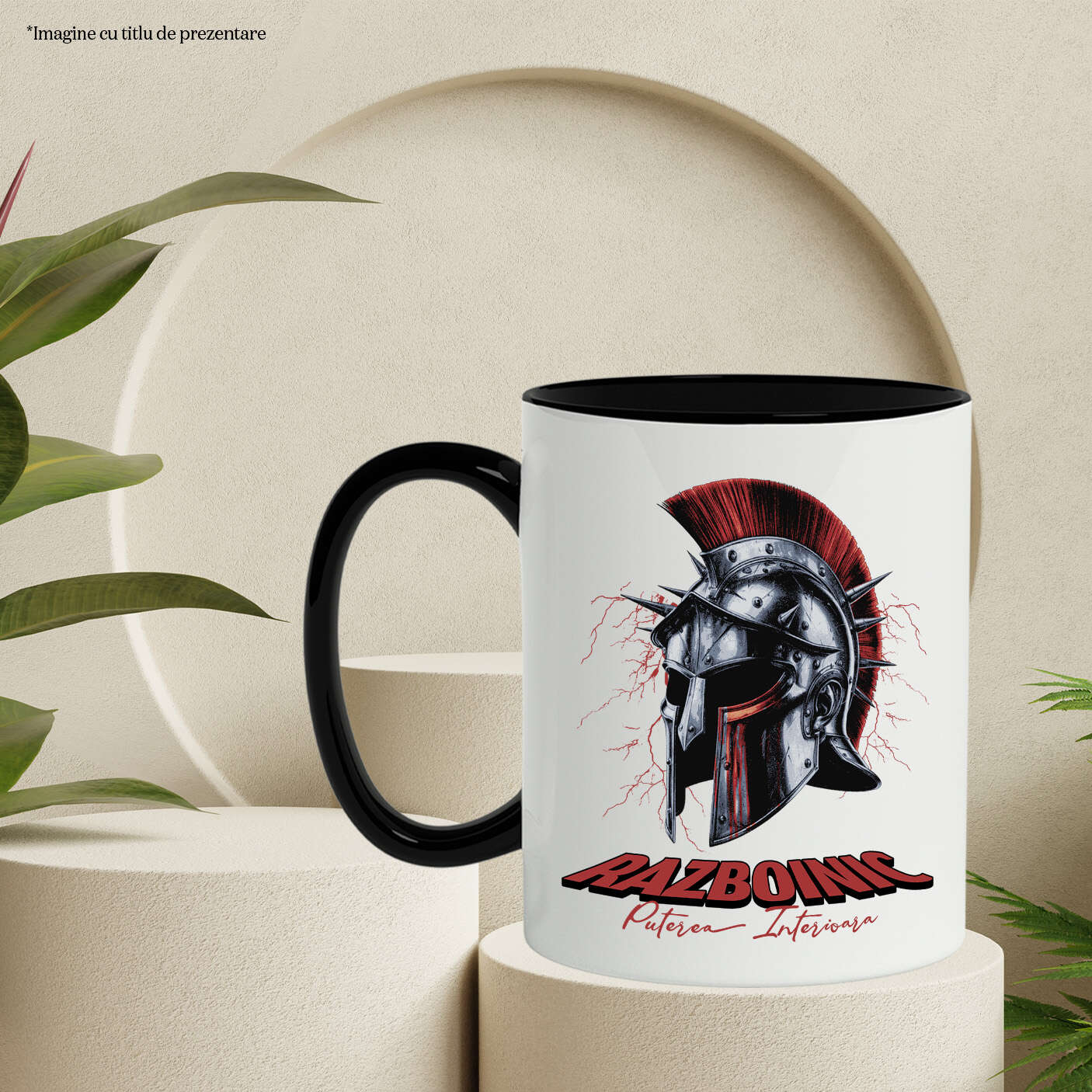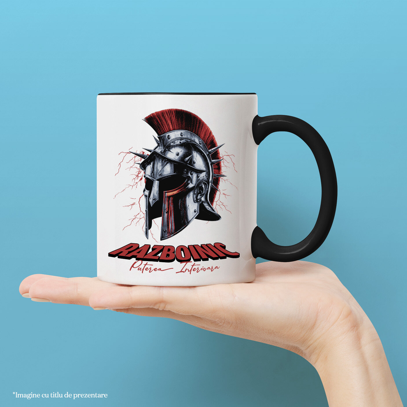 Cana Personalizata cu Coif De Razboinic Text Puterea Interioara Razboinic Mentalitate, Ceramica, 330ML, cu Maner Negru