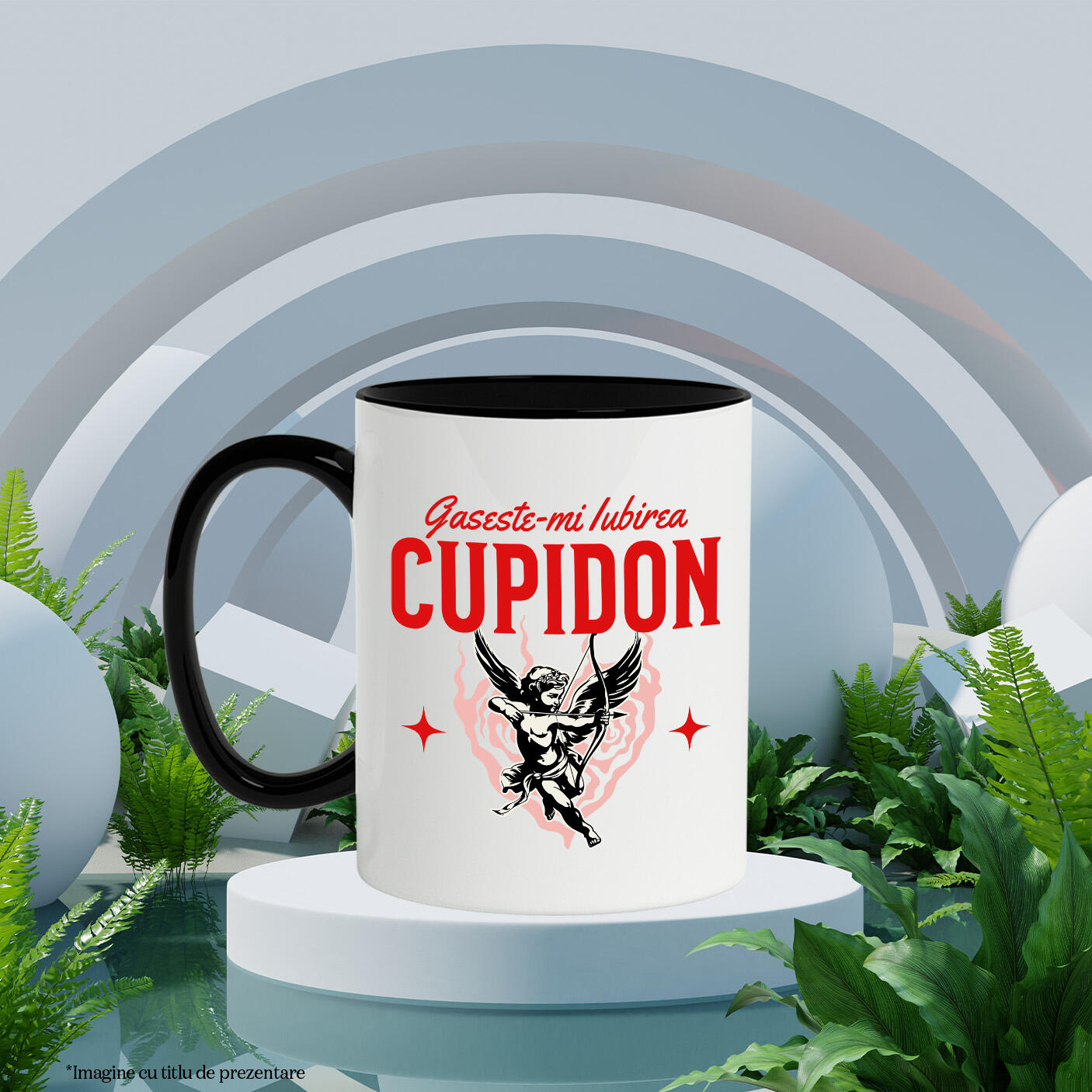 Cana Personalizata cu Cupidon Inger In Aer,Valentine's Day, Cu Sageata Si Arc, Dragoste, Ceramica, 330ML, cu Maner Negru