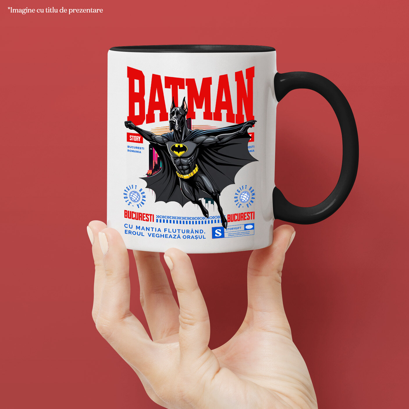 Cana Personalizata cu Dog German / Great DaneCaine In Costum de BatMan cu Pelerina, Erou Nocturn, Desene animate, Copii, Iubitorii de Animale, Ceramica, 330ML, cu Maner Negru