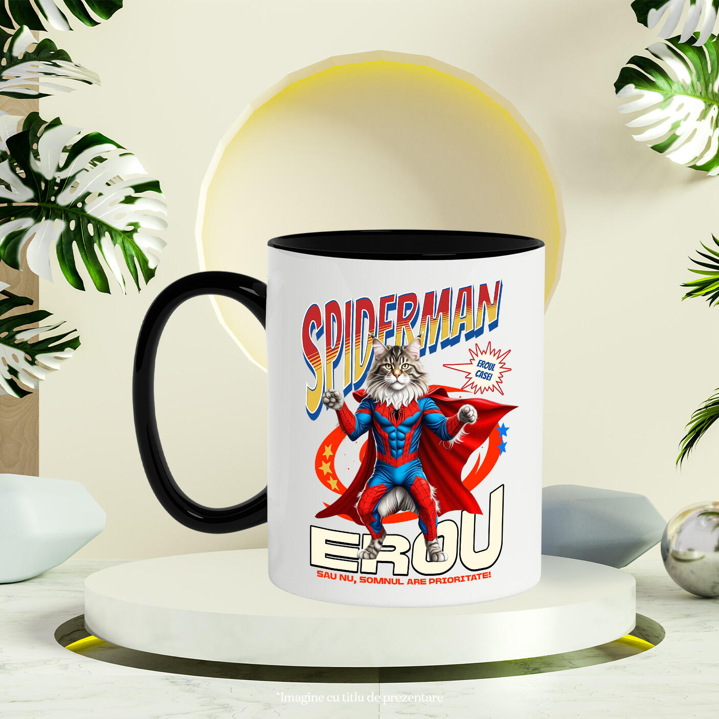 Cana Personalizata cu Maine Coon Pisica In Costum de SpiderMan cu Pelerina, Erou Nocturn, Desene animate, Copii, Iubitorii de Animale, Ceramica, 330ML, cu Maner Negru