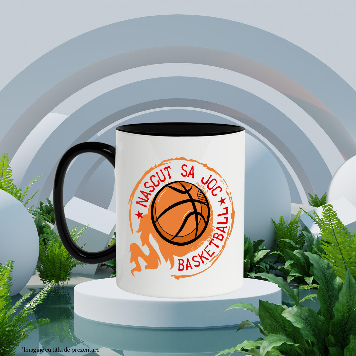 Cana Personalizata cu Minge De Basketball In Aer Flacari Sport Sanatate Motivational Nascut Sa Joc, Ceramica, 330ML, cu Maner Negru