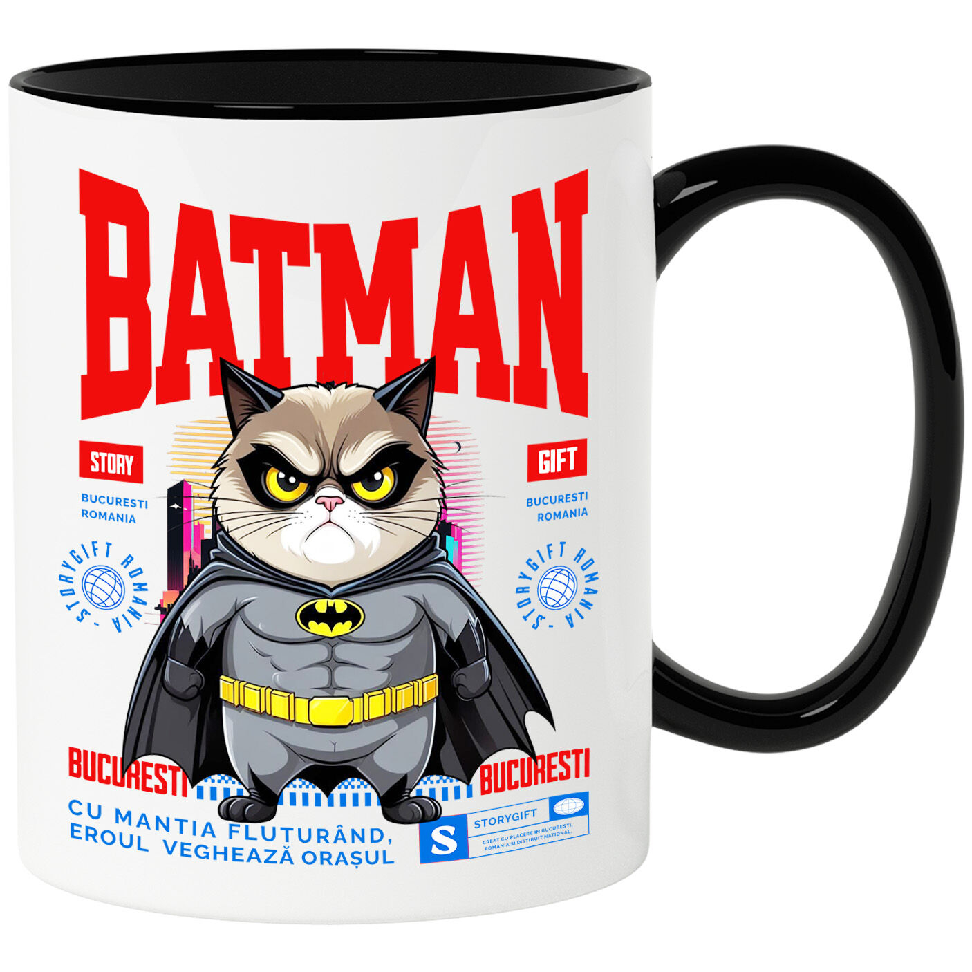 Cana Personalizata cu Pisica Morocănoasă / Grumpy cat Pisica In Costum de BatMan cu Pelerina, Erou Nocturn, Desene animate, Copii, Iubitorii de Animale, Ceramica, 330ML, cu Maner Negru