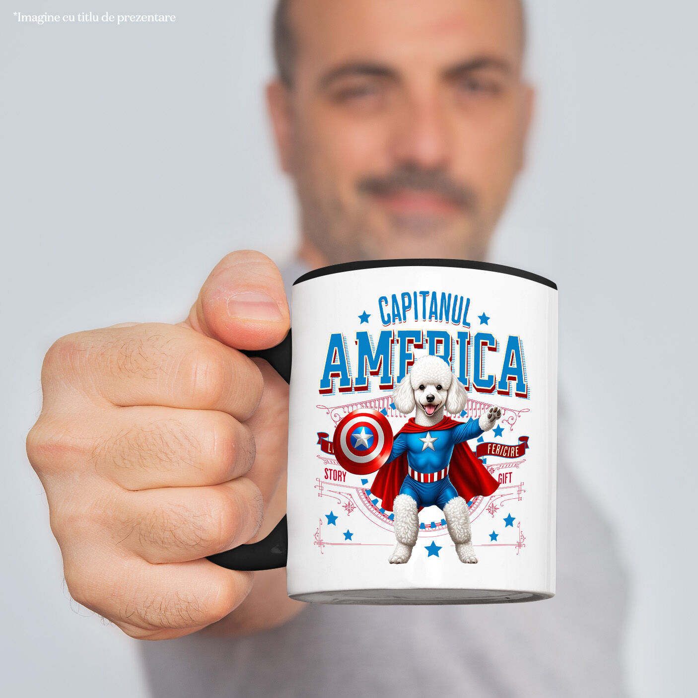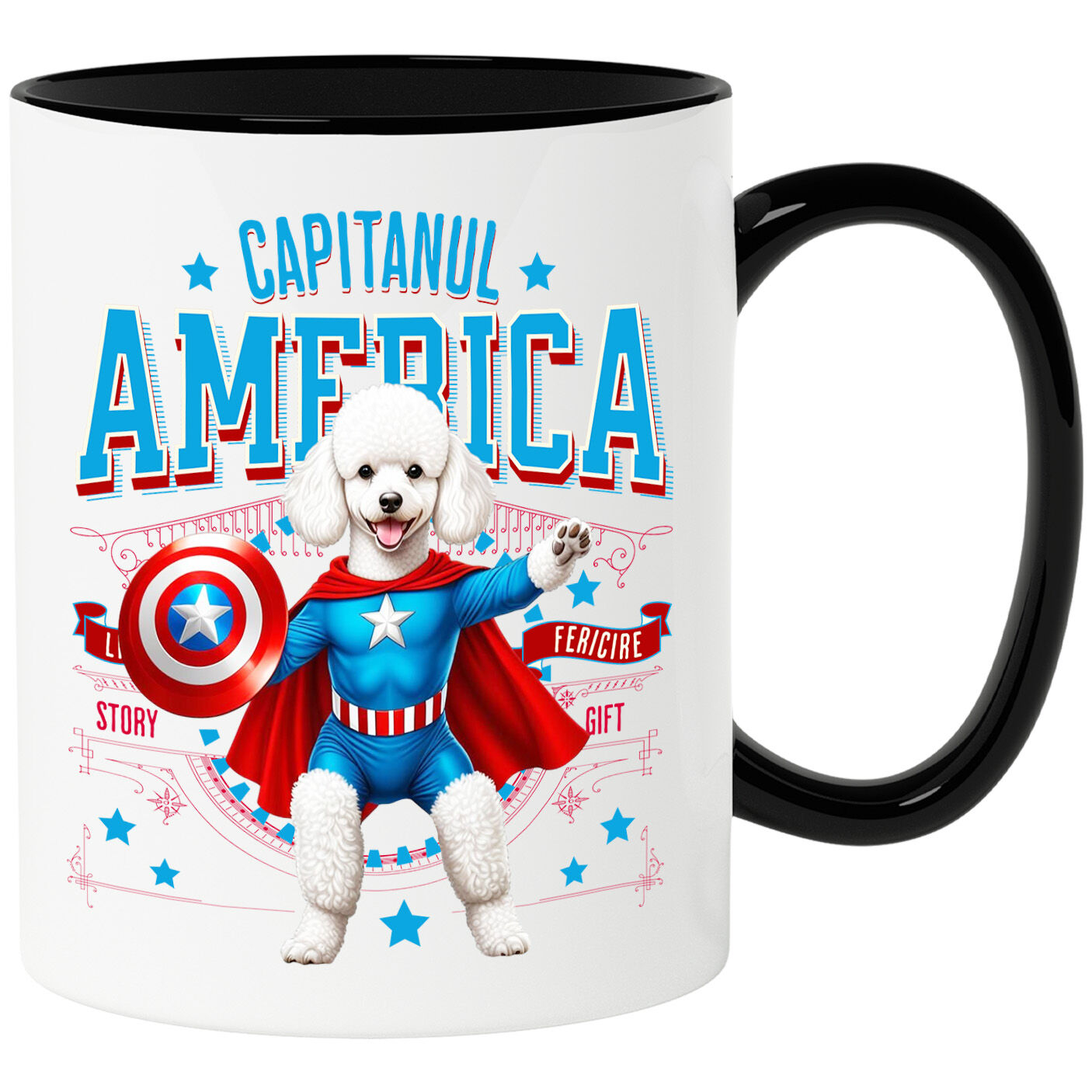 Cana Personalizata cu Pudel / Poodle Pisica In Costum de Capitan America cu Pelerina, Erou Nocturn, Desene animate, Copii, Iubitorii de Animale, Ceramica, 330ML, cu Maner Negru