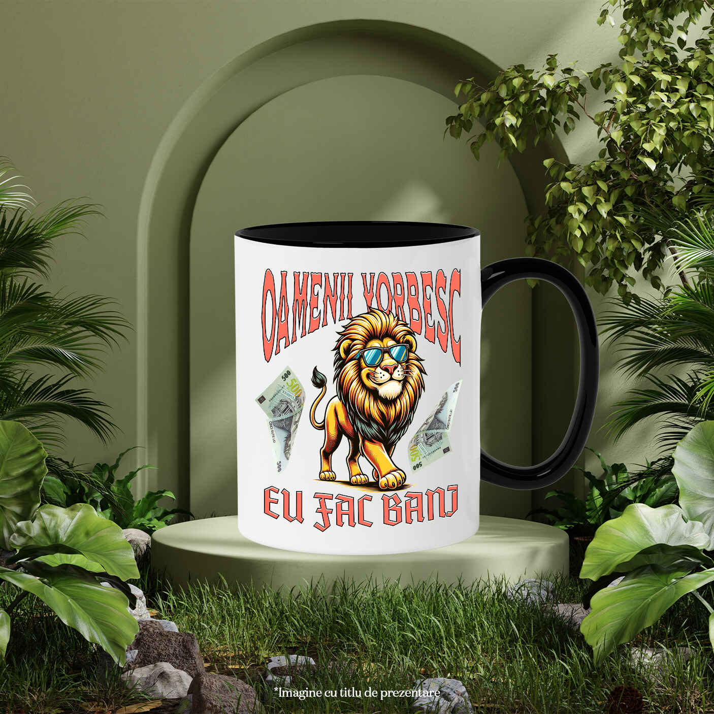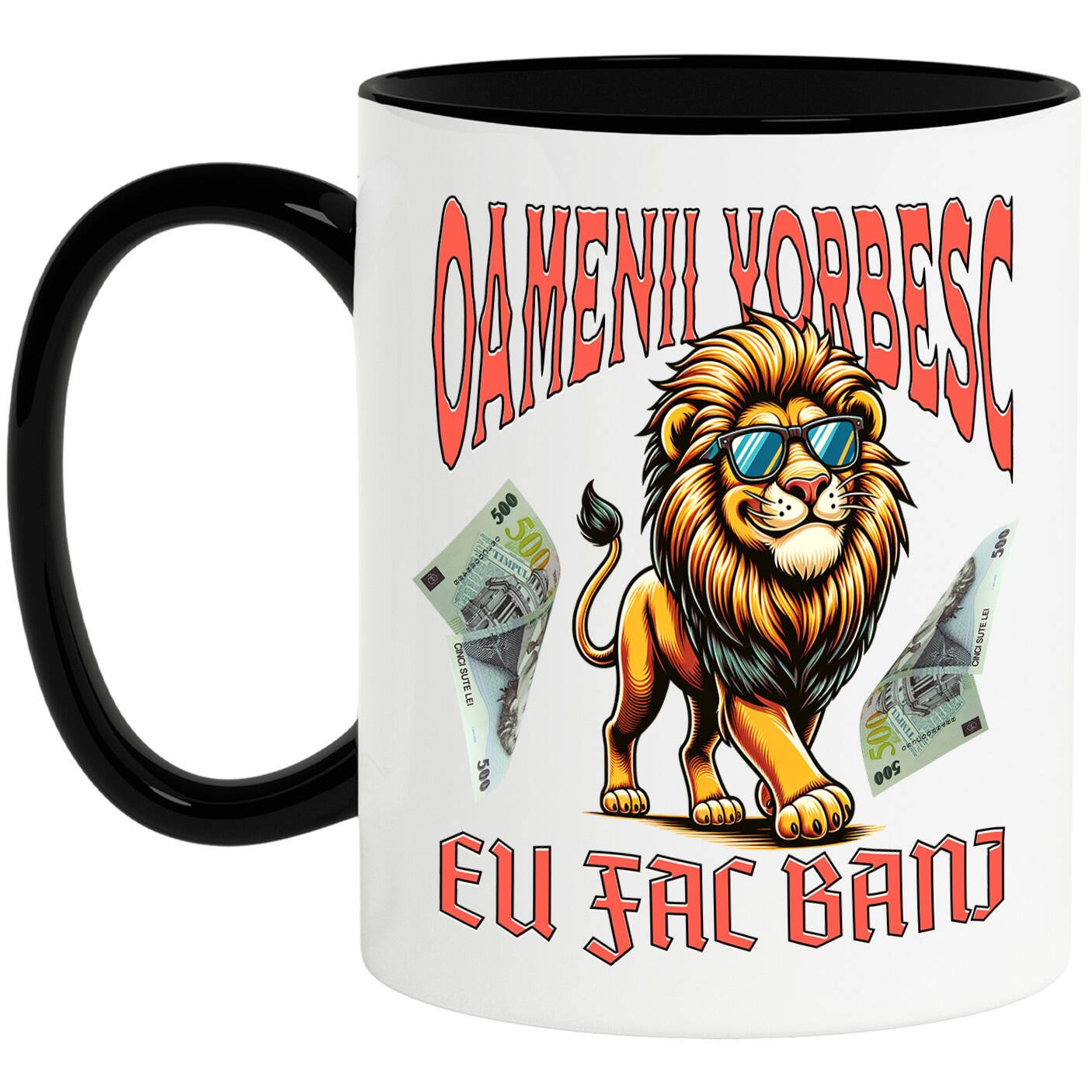 Cana Personalizata cu Regele Leu Cu Ochelari De Soare bancnote In Aer de 500 Lei, Ceramica, 330ML, cu Maner Negru